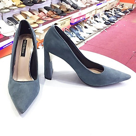 Giày cao gót thiết kế dáng mũi nhọn, chân nhọn phối đế vuông cao 6 cm. Giày có viền đính đá, làm bằng chất liệu da lộn, tone màu đẹp giúp các nàng dễ dàng