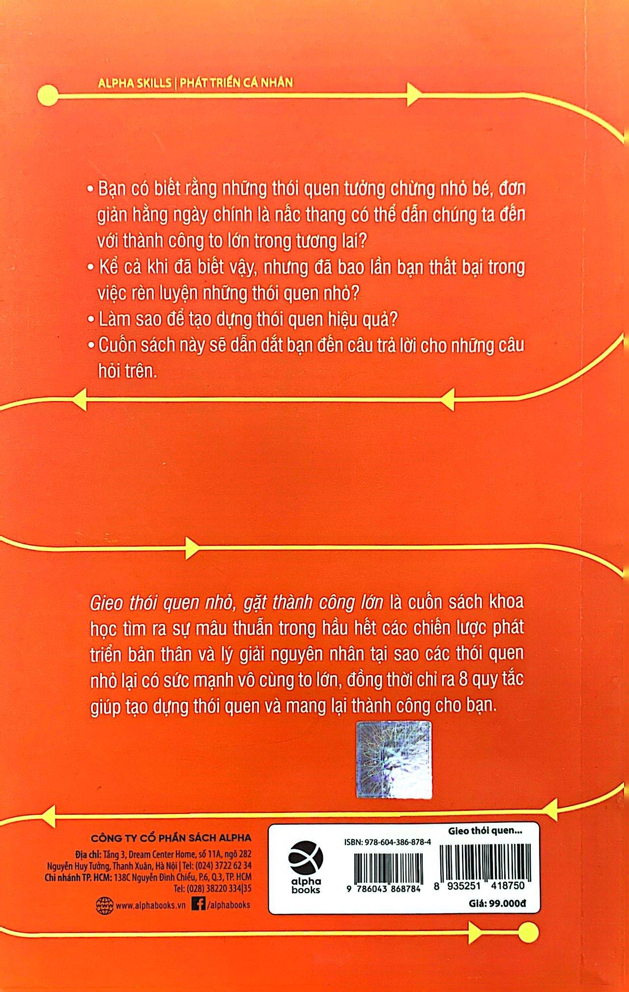 Gieo thói quen nhỏ, gặt thành công lớn là cuốn sách khoa học tìm ra sự mâu thuẫn trong hầu hết các chiến lược phát triển bản thân và lý giải nguyên nhân tại sao các thói quen nhỏ lại tạo nên sự thống nhất rõ rệt. Một thói quen nhỏ là hành vi tích cực rất nhỏ mà bạn bắt bản thân phải làm mỗi ngày. Nó “quá nhỏ để thất bại” nhưng lại mạnh mẽ không thể lường trước và là một chiến lược góp phần hình thành nên thói quen ưu việt.