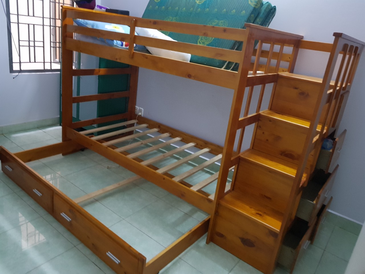 + Chất liệu: Khung giường gỗ thông Newzealand, phân tầng, Vách, đáy hộc gỗ công nghiệp, thang giường MDF chịu lực + Kích thước: kích thước phủ bì, tầng trên ưới 1mx2m Giường tầng hộp
