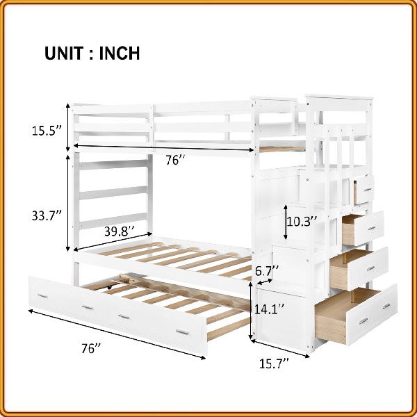 Giường tầng xuất khẩu Dundee có kích thước lọt lòng giường trên/dưới là 100x193 cm / 140 x 193 cm, phủ bì 206x148x178 cm. Khoảng cách giữa 2 tầng là 98 cm, cầu thang bố