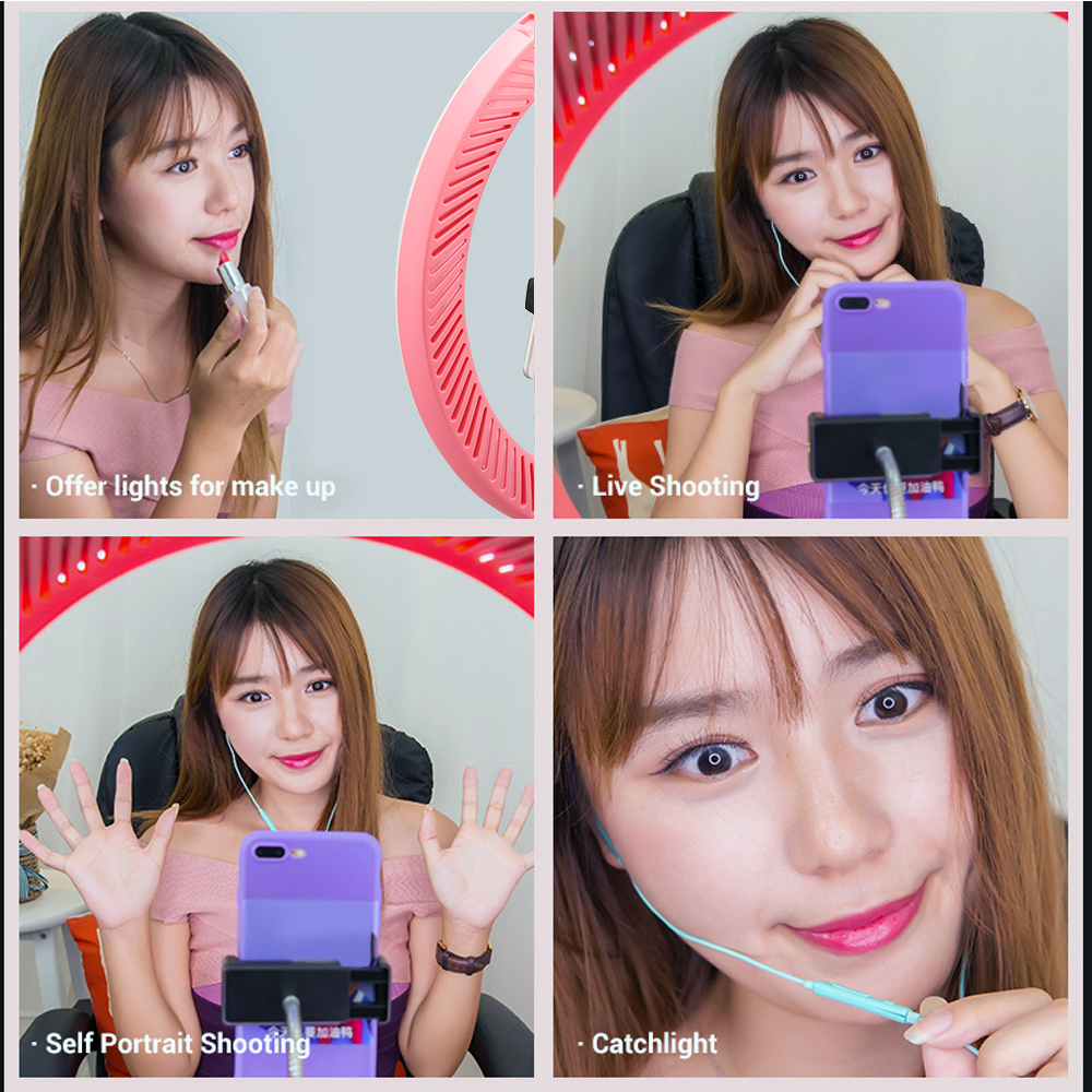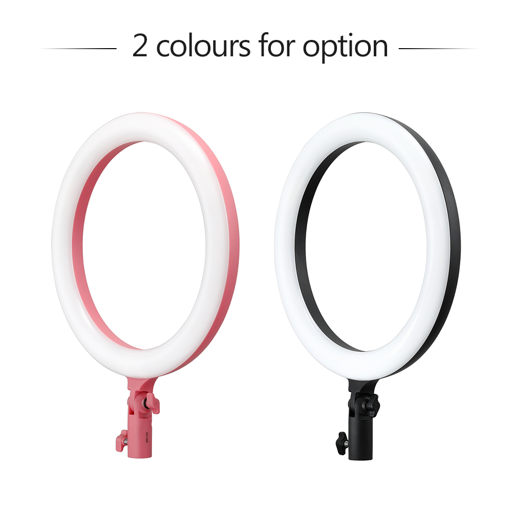 Features: 【Portable LED Ring Light】12 inch LED ring light, made of high-quality ABS material, lightweight and portable, ideal for vlogs, live streaming, selfie, makeup, studio portrait photography, etc. 【Adjustable Brightness and Color Temperature】Built-in bi-color LEDs from 3000K to 6000K, dimmable brightness ranges from 10%-100%, and CRI90, you can adjust it flexibly and easily to choose whatever lighting effect you want. 【Beautiful Catchlights of Portrait Photography】The LED ring light renders even, soft illumination and creates perfectly circular catchlights in the model eyes, which makes the portrait more attractive. 【Flexible to Use】With an adjustable phone holder, you can use smartphone with the ring light to make your live streaming more professional; 180 rotation head allows you to find the angle for optimal illumination, very flexible. 【USB Power Supply】5V USB power supply and with long USB cable, the LED light can be conveniently powered by PC/ laptop/ power bank/ power adapter (not included) and light up all day, you don't need to recharge or change battery anymore. Specifications: Brand: Godox Model: LR120 Color: Black/ Pink(optional) Power: 10W Brightness adjustment: 10%-100% Color Temperature: 3000K-6000K CRI: 90 TLCI: 90 DC Power Supply: 5V/2A Operating Temperature Range: -10℃ to 40℃ Item Size: 30.5 39.5 3.5cm/ 12 15.6 1.4in Item Weight: 435g/ 15.3oz Note: The smartphones showed in the picture are not included. Package List: 1 LED Ring Light 1 Phone Holder
