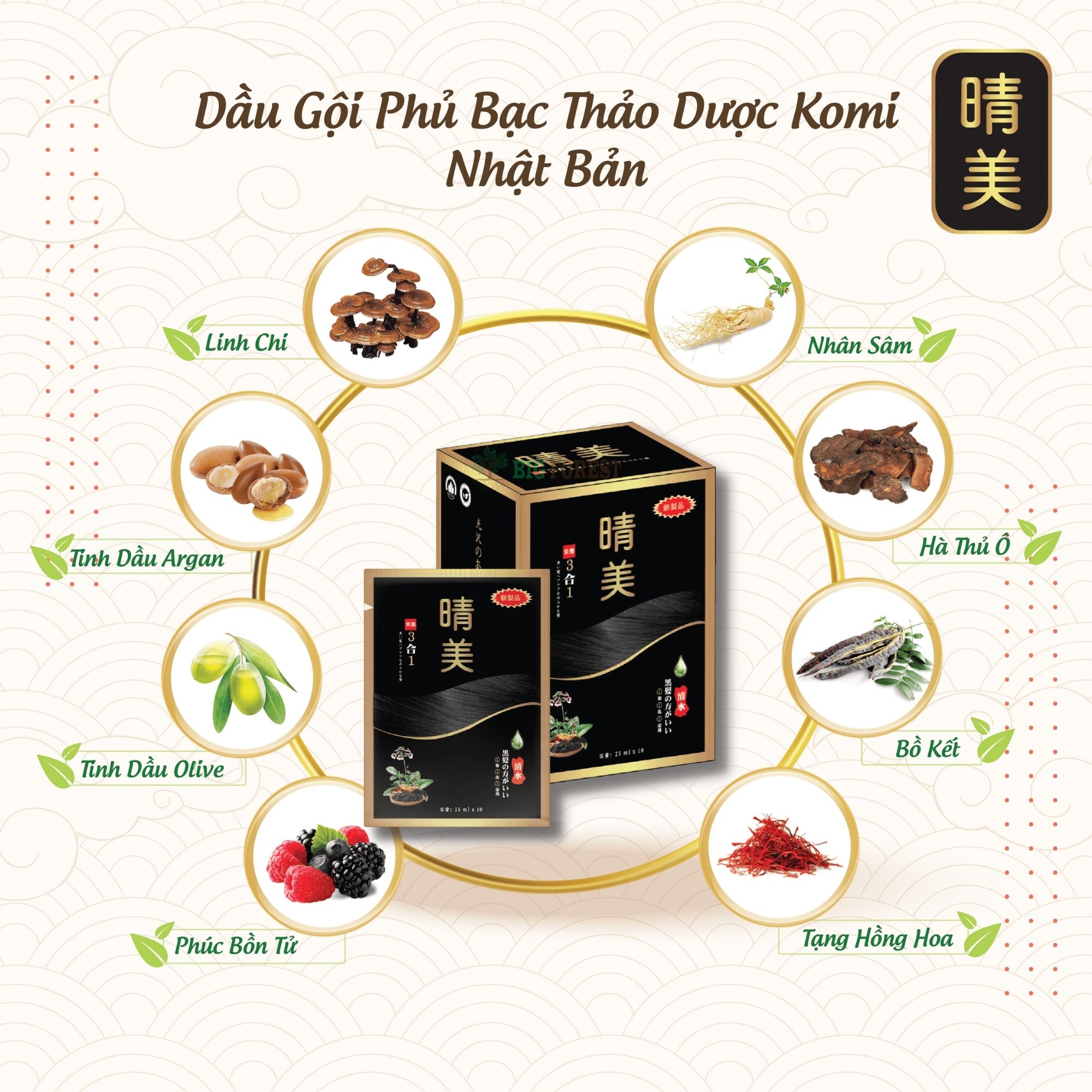 Hộp Dầu Gội Phủ Bạc Thảo Dược Komi Nhật Bản [Gói 25ml - Nâu Hạt Dẻ - Chính Hãng]   Mô tả : Ưu điểm vượt trội : ✓ Không bị xơ tóc khi sử