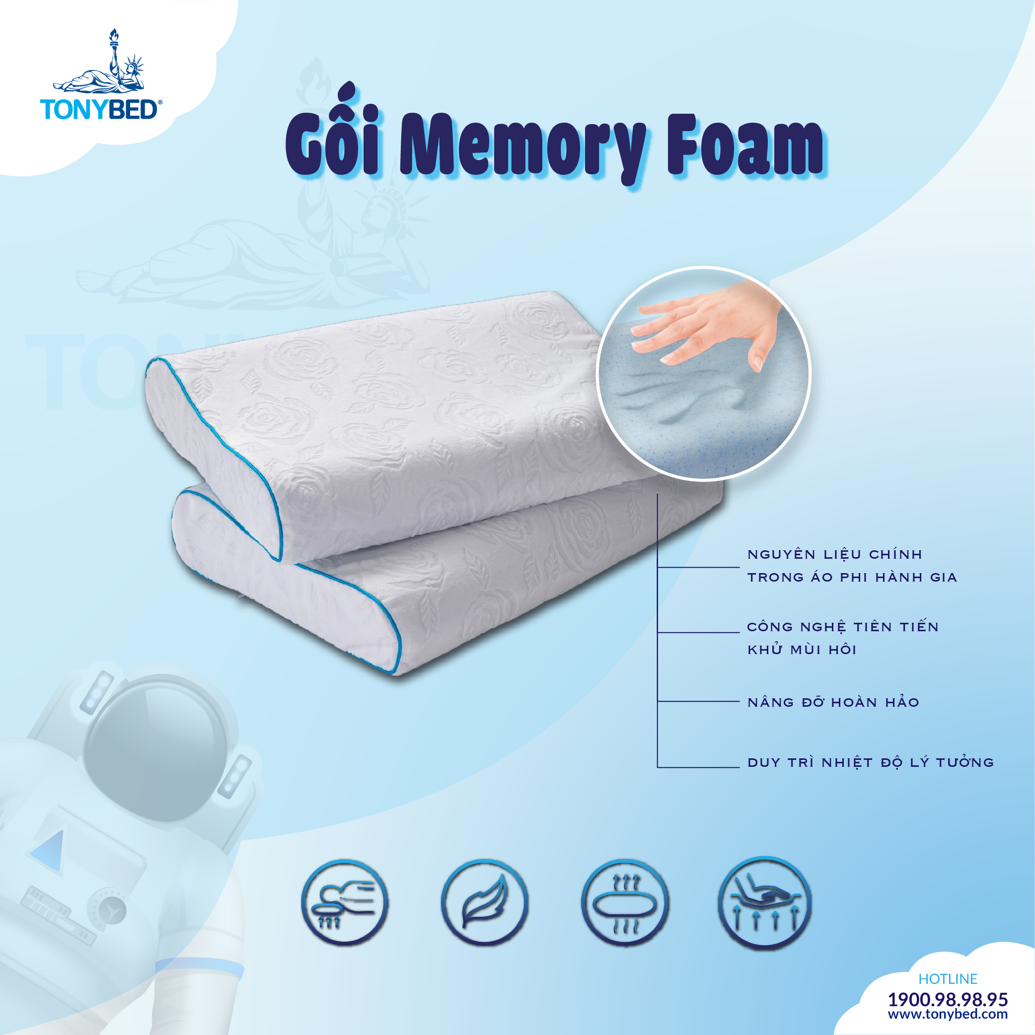 GỐI MEMORY FOAM Sử dụng 100% chất liệu Memory Foam nổi tiếng được phát minh bởi cơ quan Hàng không và Vũ trụ Hoa Kỳ (NASA) và được dùng để chế tạo những lớp nệm
