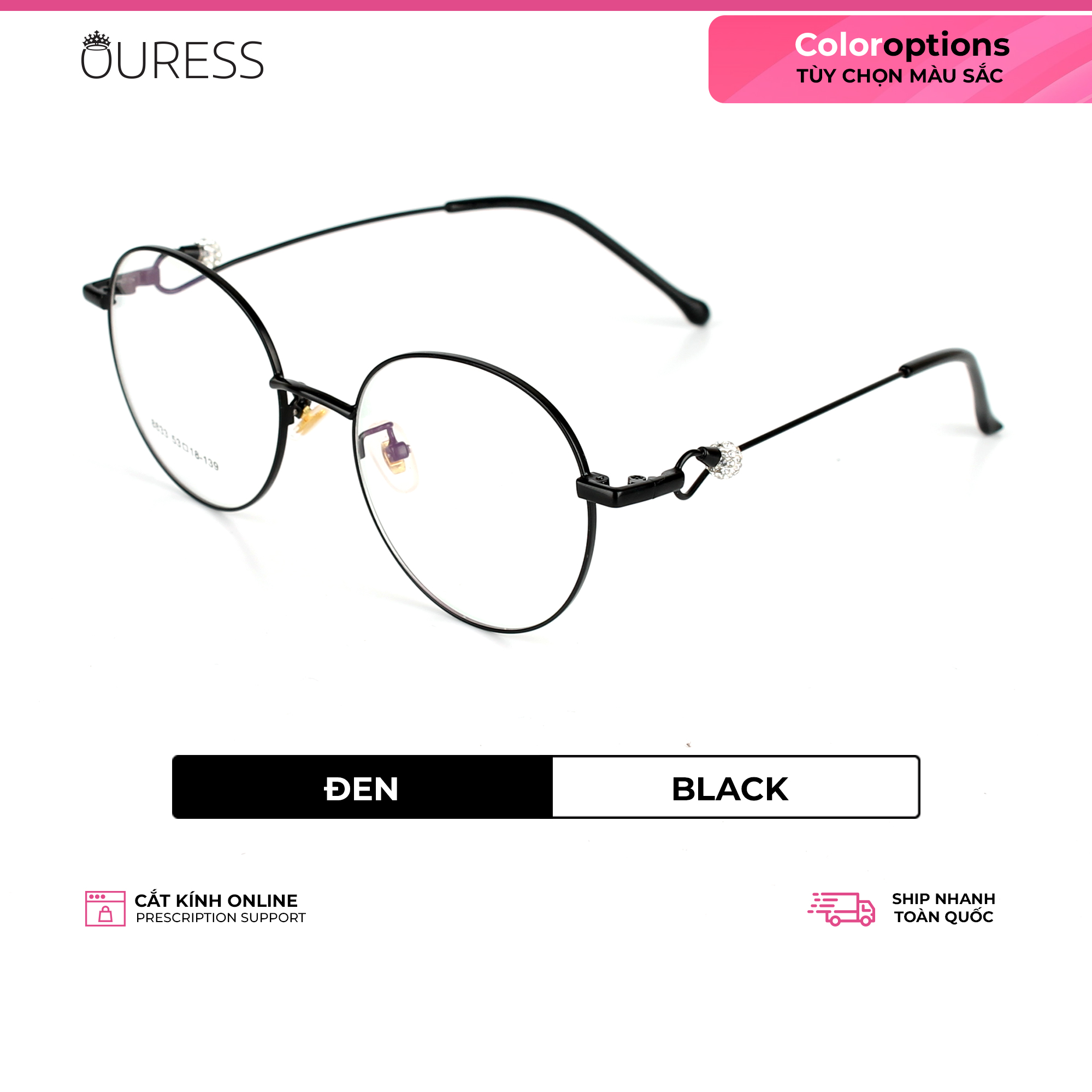 - Giá tròng phía trên là GIÁ 1 CẶP TRÒNG KÍNH Bộ phụ kiện : Hộp đựng kính ko đi kèm chung với sản phẩm này. —-------------------------------------- GỌNG KÍNH CẬN HỢP KIM NAM NỮ THỜI TRANG - OURESS • Càng kính dày dặn, chắc chắn, cũng cùng chất liệu hợp kim. Cuối chân kính bọc nhựa giúp người mang không đau ở vành tai, thoải mái mang cả ngày, kể cả khi đội mũ bảo hiểm ôm sát đầu. • Chống xước tối ưu –Chống trượt, chống gãy hiệu quả. • Đệm mũi trong suốt có thể tùy chỉnh. • Thiết kế unisex, thời trang, đa dạng mẫu mã, phù hợp cho cả nam và nữ. • Đủ form trendy cho bạn chọn: tròn ngố, lục giác, mắt mèo, tròn bầu,… —-------------------------------------- HƯỚNG DẪN CÁCH ĐỌC THÔNG SỐ GỌNG KÍNH Thông thường, nhà sản xuất sẽ in thông số trên tròng kính hoặc càng kính để người dùng hình dung về các kích thước của gọng kính. Ví dụ, trên tròng kính bạn thấy một dãy số: 8001 52[]18-142, thì hiểu như sau: • 8001 là mã gọng kính • Số 52 phía trước ô vuông [], là kích thước tròng kính (chiều ngang). Trong ví dụ là 52mm. • Số 18 phía sau ô vuông [], là kích thước cầu nối hai tròng mắt, thường gọi là cầu kính. Trong ví dụ là 18mm • Số 142 là kích thước càng kính. Trong ví dụ là 142mm (=14,2cm) —--------------------------------------