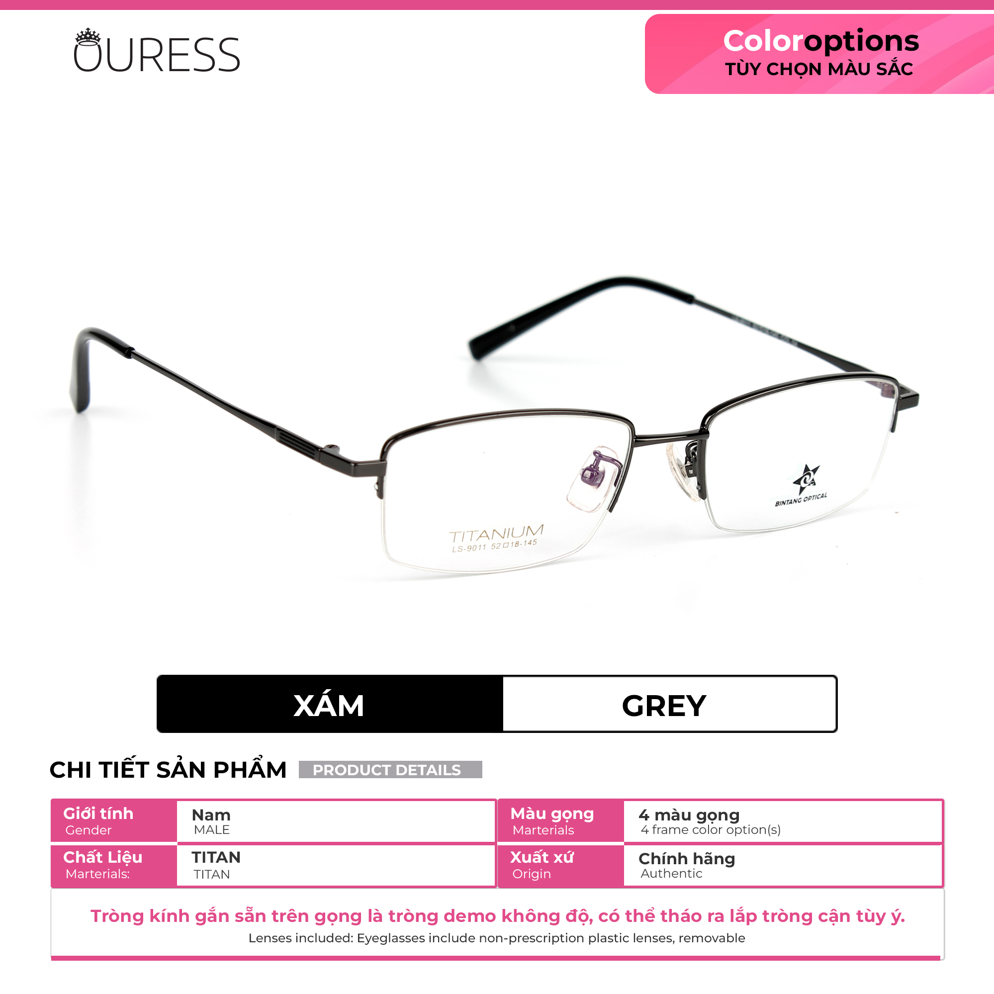 Chất Liệu: titanium hay còn gọi là titan ---------------------- Titan là dòng chất liệu mềm, nhẹ và rất bền. Những loại gọng kính được làm từ titan này sẽ hạn chế được oxi hóa cao và nhẹ hơn so với những gọng kính kim loại thường. Ngoài trọng lượng nhẹ, titan rất ít bị ăn mòn hay hoen gỉ kể cả khi tiếp xúc với axit thông thường. Gọng kính nửa khung (xẻ cước) titan mang nhiều ưu điểm vượt trội hơn các gọng kính thông thường khác. Cụ thể như: Khung gọng kính là loại nửa khung hay còn gọi là xẻ cước, tạo nên nét đẹp thời trang và nhẹ nhàng thanh thoát trên gương mặt Gọng kính được thiết kế tỉ mỉ hơn với vẻ đẹp góc cạnh và đường nét tinh tế, sang trọng,đôi khi có 1 số sản phẩm sẽ kèm những chạm khắc trên gọng kính hoặc càng kính, taọ thêm điểm nhấn cho chiếc kính được sang trọng và tinh tế hơn. Gọng kính có độ bền, và tính đàn hồi cao, khó trầy xước và bong tróc hơn những chiếc kính kim loại khi có tác động ngoại lực . Không bị ăn mòn oxy cao trong quá trình sử dụng, không bị hoen gỉ, xỉn màu . Không gây kích ứng da, kể cả da nhạy cảm . Gọng kính thanh mảnh, nhẹ hơn kim loại tạo cảm giác dễ chịu cho người đeo kính . Thích hợp với mọi lứa tuổi và dễ dùng cho mọi giới tính. Càng kính hoàn toàn rất thanh mảnh và nhẹ, nhưng vẫn giữ được sự chắc chắn của chiếc kính trên gương mặt người đeo Phần đuôi càng kính được bọc nhựa, giúp ôm sát vành tai hơn và hạn chế rơi tuột kính. Ve mũi được cấu tạo bằng nhựa silicon mềm tạo nên sự mềm mại không gây cảm giác khó chịu đau buốt vùng mũi, đặc biệt với người mồ hôi dầu sẽ hạn chế tuột kính nhiều hơn các loại ve mũi khác ==>> Gọng kính nửa khung (xẻ cước) titan thực sự là phụ kiện mang đến sự tự tin, Sang trọng và cao cấp. Chắc chắn sản phẩm sẽ mang đến sự hài lòng và thể hiện được nét riêng về phong cách cũng như sự lịch lãm của bạn!