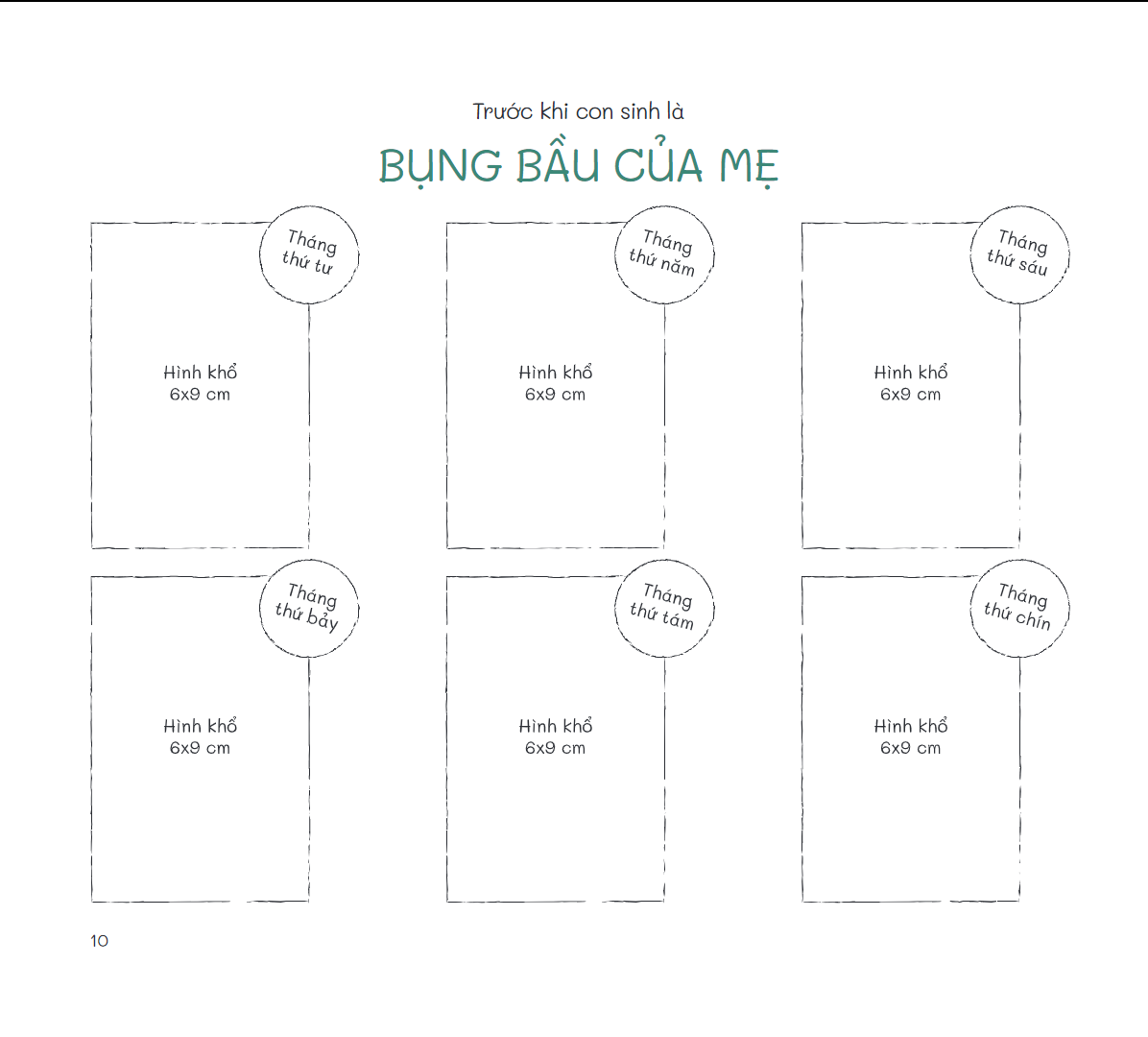 Một điều thú vị nữa, là tập sách này còn có những trang mở để mẹ ghi chép lại những cảm xúc của chính mẹ, trong hành trình yêu thương gắn liền với bé từ khi bé còn là cái mầm chút xíu trong bụng mẹ, cho đến khi bé tròn thôi nôi. Những khung ảnh trống cũng để dành cho mẹ cắt, dán hình ảnh của bé và các ‘nhân vật có liên quan’ đến bé. Sau này lớn lên, ngắm lại những dòng chữ này, những tấm ảnh này, sẽ nhớ và yêu lắm. Và những ký ức này sẽ trở nên quý giá hơn bao giờ hết và không tiền bạc nào mua nổi.