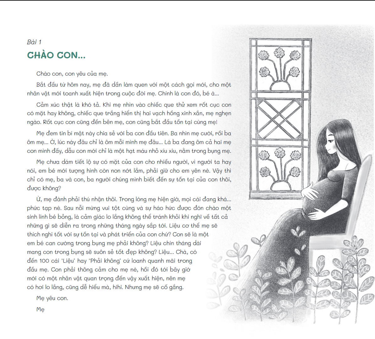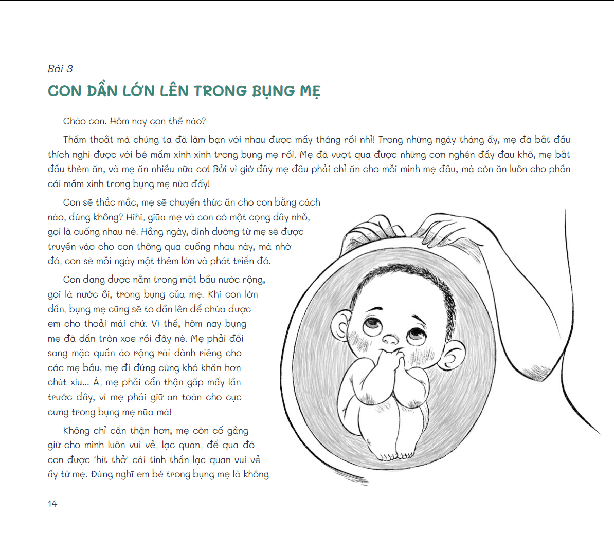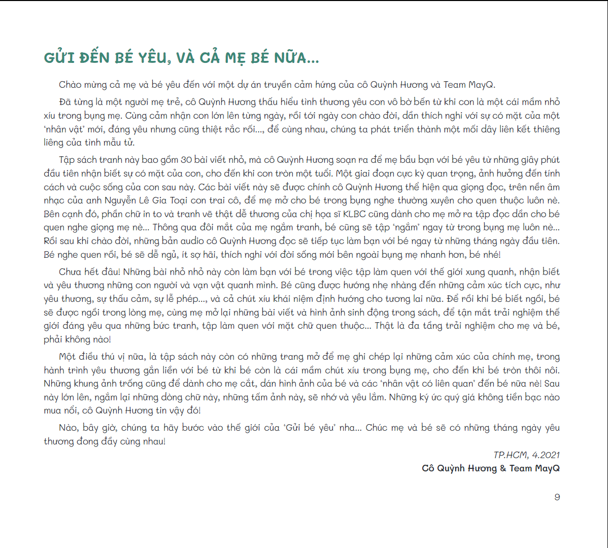 Tập sách tranh này bao gồm 30 bài viết nhỏ, mà cô Quỳnh Hương soạn ra để mẹ bầu bạn với bé yêu từ những giây phút đầu tiên nhận biết sự có mặt của con, cho đến khi con tròn một tuổi. Một giai đoạn cực kỳ quan trọng, ảnh hưởng đến tính cách và cuộc sống của con sau này. Các bài viết này sẽ được chính cô Quỳnh Hương thể hiện qua giọng đọc, trên nền âm nhạc của anh Nguyễn Lê Gia Toại con trai cô, để mẹ mở cho bé trong bụng nghe thường xuyên cho quen thuộc luôn nè. Bên cạnh đó, phần chữ in to và tranh vẽ thật dễ thương của chị họa sĩ KLBC cũng dành cho mẹ mở ra tập đọc dần cho bé quen nghe giọng mẹ Thông qua đôi mắt của mẹ ngắm tranh, bé cũng sẽ tập ‘ngắm’ ngay từ trong bụng mẹ Rồi sau khi chào đời, những bản audio cô Quỳnh Hương đọc sẽ tiếp tục làm bạn với bé ngay từ những tháng ngày đầu tiên. Bé nghe quen rồi, bé sẽ dễ ngủ, ít sợ hãi, thích nghi với đời sống mới bên ngoài bụng mẹ nhanh hơn, bé nhé!
