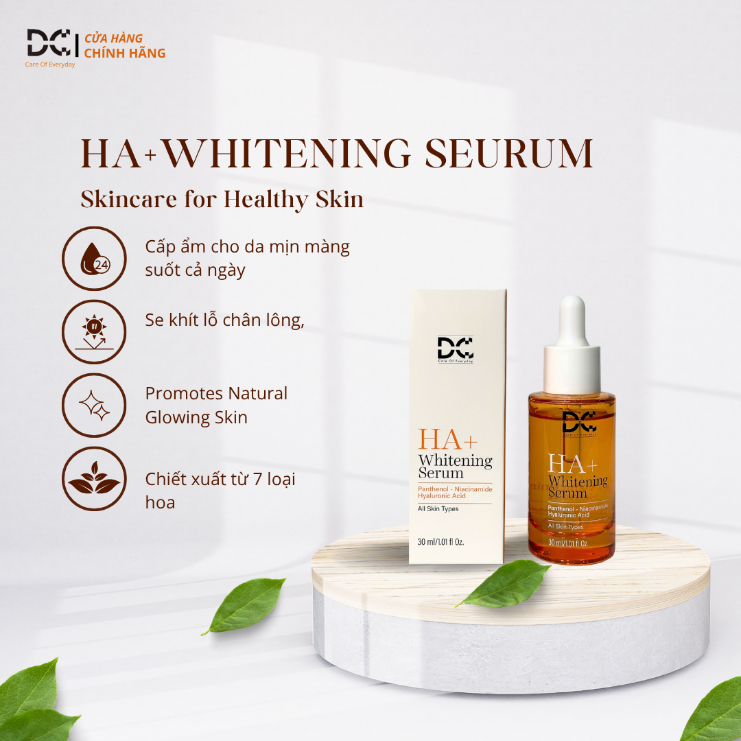 Mua tại Tiktok- HA + Whitening Serum DC - Serum Dưỡng Trắng Da 30ml có tính năng cấp ẩm tối ưu từ hoạt chất HA giúp da săn chắc mịn màng và phù hợp với mọi loại da.