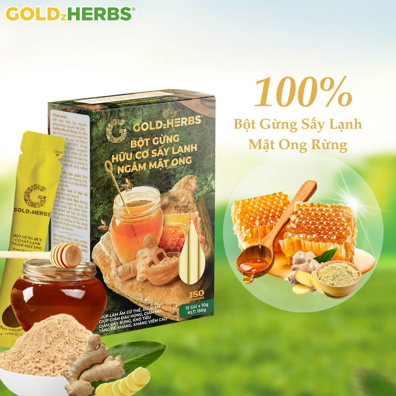 ✨Hàng chính hãng - Bột gừng hữu cơ sấy lạnh ngâm mật ong GoldzHerbs, 100% mật ong nguyên chất – Hũ 300g/ Hộp 15 gói