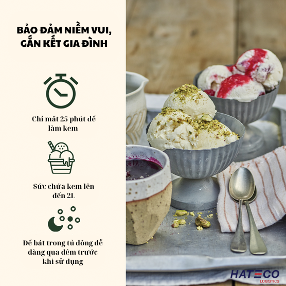 - Điện 220V Công suất: 300w Dung tích: 2 Lít Khối lượng: 5kg Xuất xứ: Trung Quốc Bảo hành: 24 tháng. Cách sử dụng : Chuẩn bị sẵn thành phần nguyên liệu theo công thức làm kem trong tập sách hướng dẫn kèm theo máy làm kem tươi hoặc sử dụng công thức riêng của bạn, bạn phải cân đối thành phần nguyên liệu để lượng thành phẩm không quá dung tích tối đa của máy là 2 lít. Lấy thố trộn đã được đông lạnh hoàn toàn từ ngăn đá ra ( để trong tủ đông từ 16-22 tiếng trước khi làm kem), lắp vào máy, vì thố trộn sẽ rã đông nhanh chóng sau khi lấy ra, nên bạn cần tiến hành quay kem ngay lập tức Đặt bộ phận quay kem vào trong thố trộn, nằm ở trung tâm của thố, với hình vòng tròn hướng lên trên. Chụp nắp máy lên thố trộn và xoay theo chiều kim đồng hồ cho đến khi các rãnh trên nắp khớp với thố. Bấm On/Off chuyển sang vị trí ON. Thố trộn sẽ bắt đầu quay. Ngay lập tức cho nguyên liệu vào thông qua khoảng hở phía trên . Chú ý: chỉ cho nguyên liệu vào thố trộn sau khi bật chế độ ON. Đổ hỗn hợp kem lạnh vào bát làm kem, để máy chạy khoảng 30-35 phút theo hướng dẫn của nhà sản xuất hoặc khi thấy kem của bạn mịn xốp, nổi vân là được. Lưu ý không quay quá lâu có thể làm tách nước hỗn hợp kem. Nếu bạn muốn trộn thêm hạt hay socola bào vào kem, chỉ nên cho vào phút cuối và trộn bằng tay sau khi tắt máy. Nếu bạn muốn kem đông cứng hơn nữa, bạn múc hết kem trong thố ra hộp, đậy kín và để trong ngăn đá hai hoặc nhiều giờ. CUISINART VIỆT NAM Hotline: 0365495688 Email: hatecotrading@ Hệ thống phân phối Online chính thức của Cuisinart Việt Nam