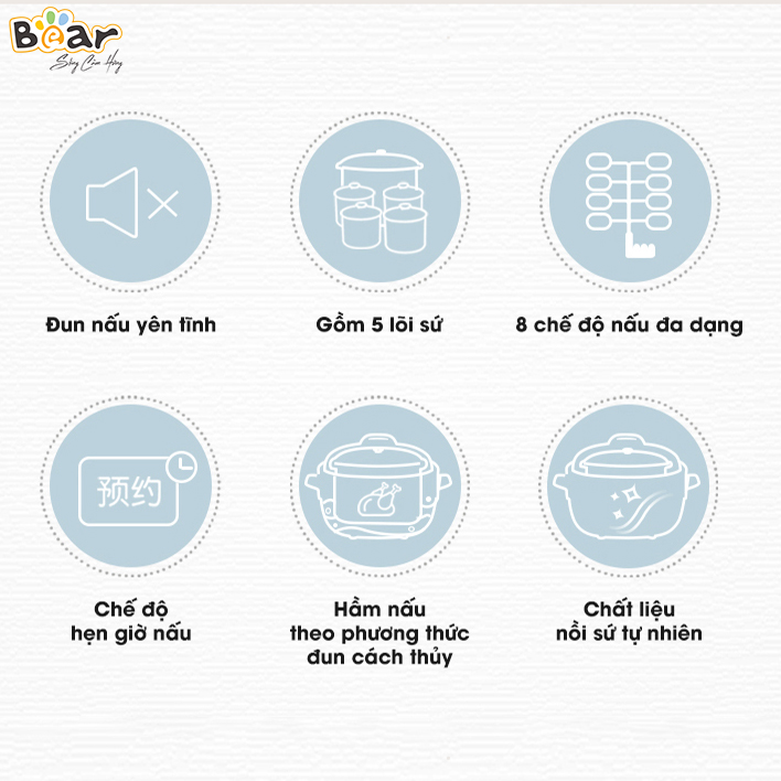 Nồi Nấu Chậm 2.5L Bear SUBE003 Gồm 5 Thố Sứ Và Xửng Hấp - Bản Tiếng Việt