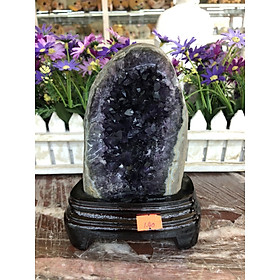 Chất liệu: Đá thạch anh tím Khối lương: 1,4 kg Kích thước: cao 17,5 cm Hốc thạch anh tím - động thạch anh tím là sự kết tinh của các tinh thể thạch anh tím nhỏ li ti sáng lấp lánh được bao bọc bởi lớp đá thô bên ngoài, tạo ra một trường khí năng lượng cả trong lẫn ngoài, cát khí tốt sẽ được tích tụ bên trong lòng của hốc thạch anh và giữ lại vượng khí, tài lộc cho gia chủ. Vị trí đặt: Để bàn làm việc, phòng khách, trưng bày, bàn học, bàn thờ thần tài, cửa hàng kinh doanh, két sắt, quà tặng ý nghĩa.