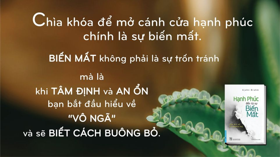 Đó là vì ta thường nghĩ đến mình và sợ mất đi những thứ “của mình”. Đối với Ajahn Brahm, chìa khóa để mở cánh cửa hạnh phúc vĩnh hằng và bình an chính là buông bỏ. Biến mất là dứt bỏ tất cả mọi thứ, không chuốc thêm vật chất hay giành giật địa vị. Khi ta dứt bỏ cái gì đó, dứt bỏ thật sự thì nó biến mất. Đó là sự biến mất từ trong ra ngoài, sự biến mất của cái tôi – bản ngã. Dứt bỏ cái tôi thì ta dứt bỏ được tất cả phù phiếm, ảo ảnh bên ngoài; dứt bỏ được những nỗi đau, lo lắng thua thiệt đi kèm nó. Từ đó, ta tìm được bình yên thực sự, tìm được niềm hạnh phúc bất diệt.