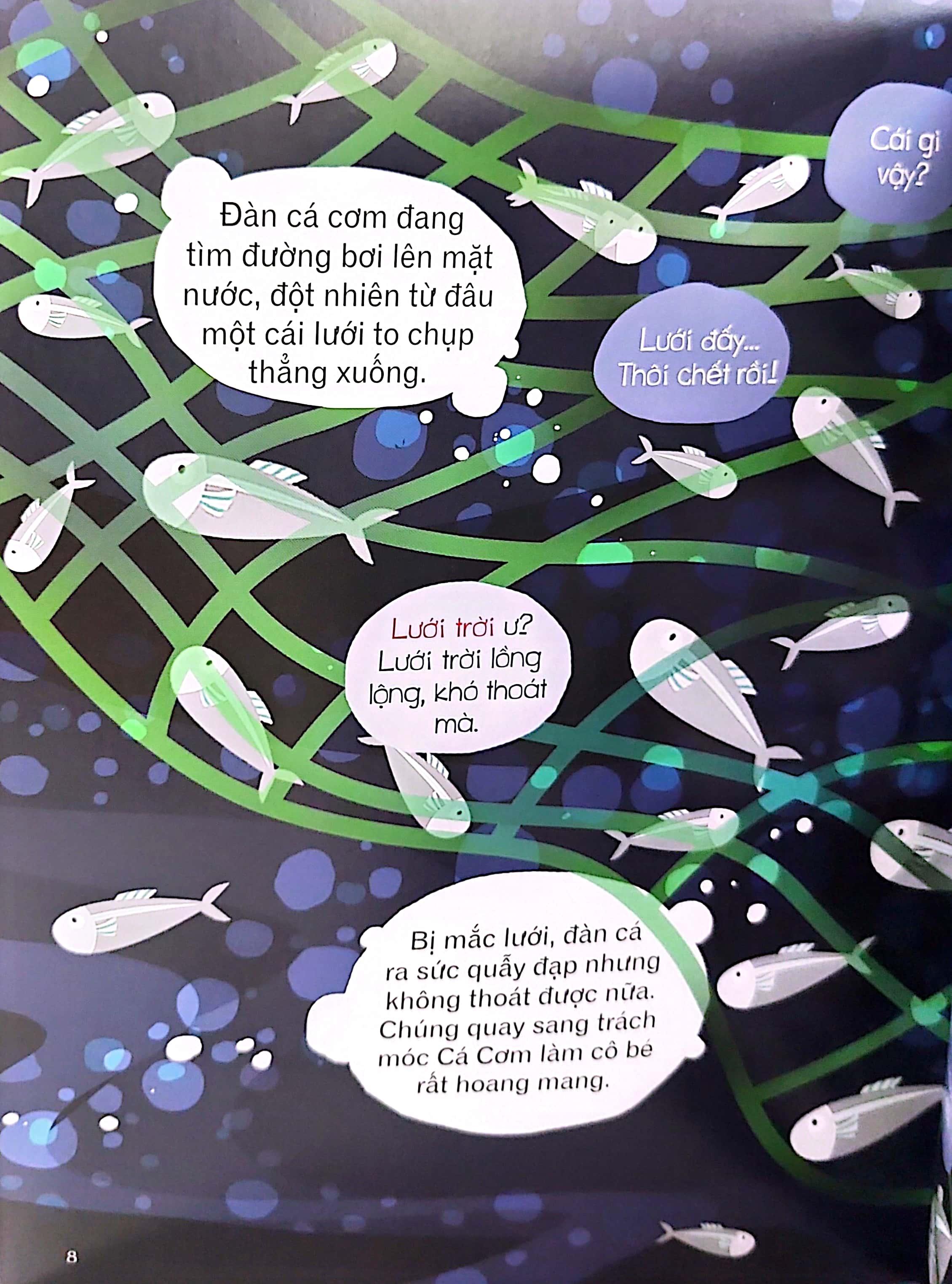 Ở Vương Quốc CÁ, vì bé nhỏ nên Cá Cơm hay bị các loài cá khác trêu chọc và bắt nạt. Cá Cơm buồn lắm. Một ngày nọ, cô bé tập hợp gia đình m.ình lại và thông báo một quyết định táo bạo: Cá Cơm sẽ lên bờ .
