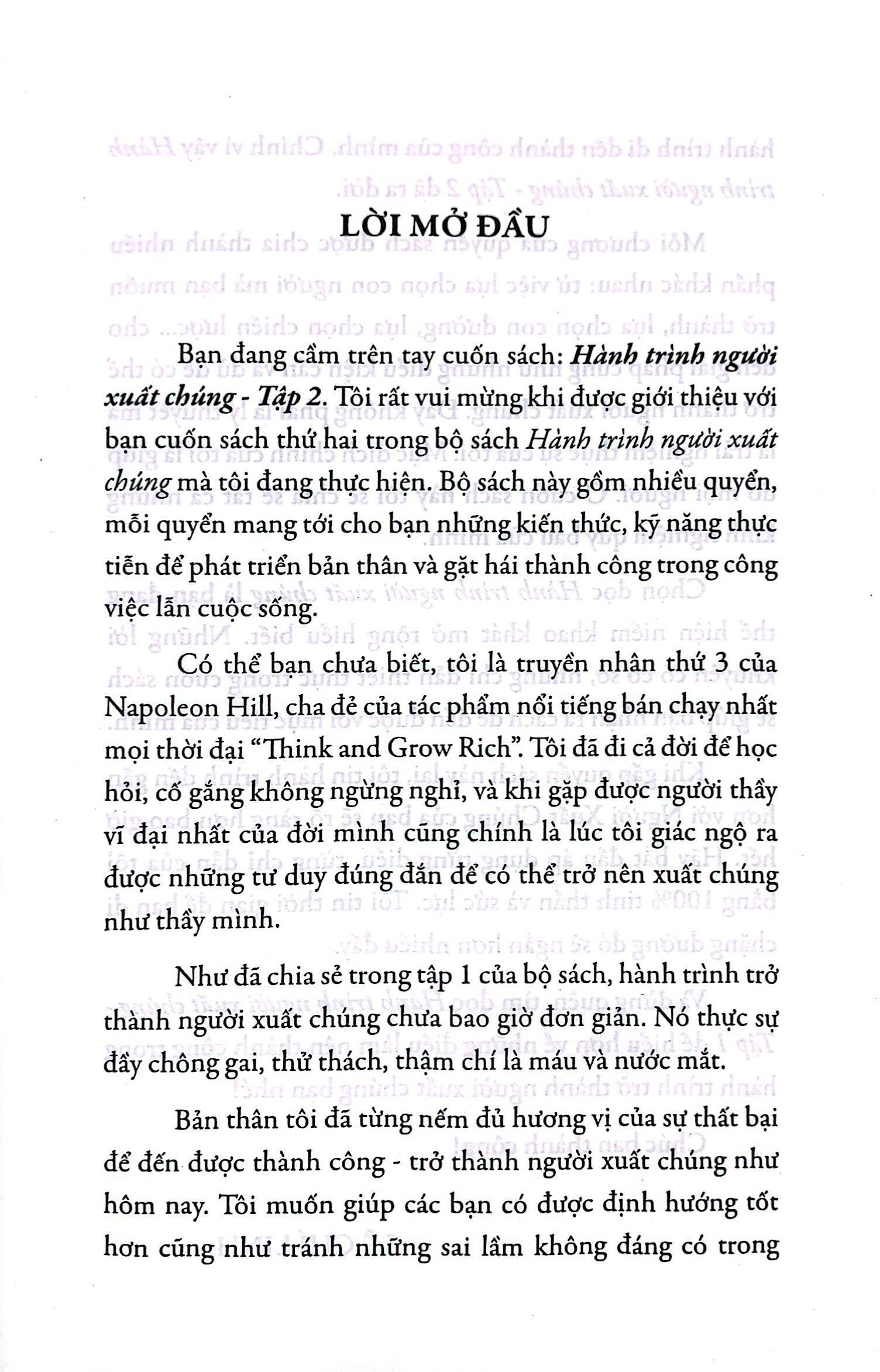 Không bao giờ bỏ cuộc, không bao giờ ngừng tin tưởng chính m.ình. Hãy tạo ra kỷ luật, động lực và năng lượng tích cực cho mỗi phút giây bạn sống trên đời. Bạn sẽ nhận ra không chỉ bạn, mà cả những người đồng hành với bạn cũng sẽ có những thay đổi vượt bậc. Hãy đặt ra những nguyên tắc để thành công, vẽ cho m.ình những mục tiêu lớn, liên tục cho đi để có thể nhận về những điều tốt đẹp. Hãy mơ và hãy hành động để biến ước mơ thành hiện thực. Xuất chúng từ tư tưởng đến con người. Đó là hành trình bạn phải đi.