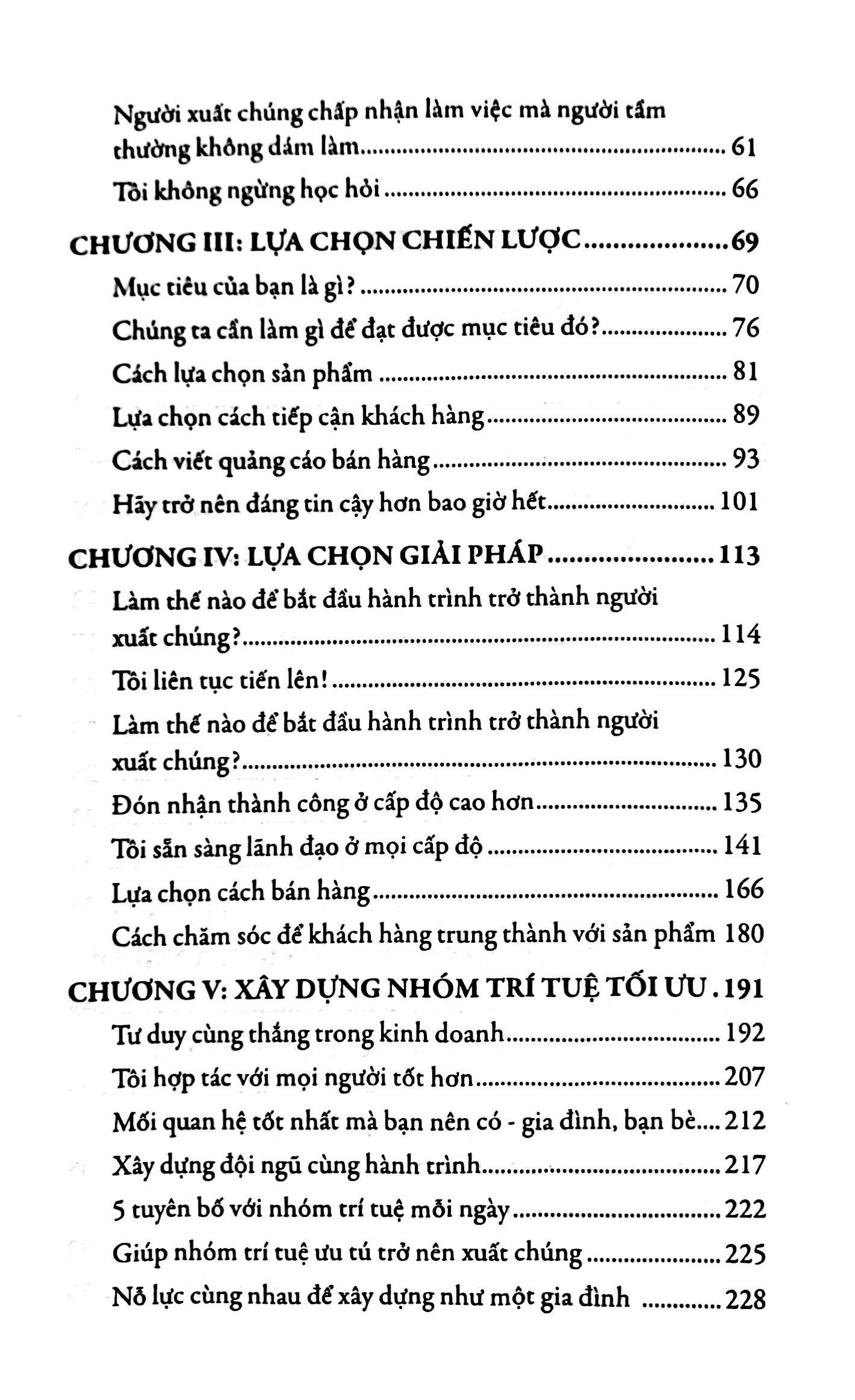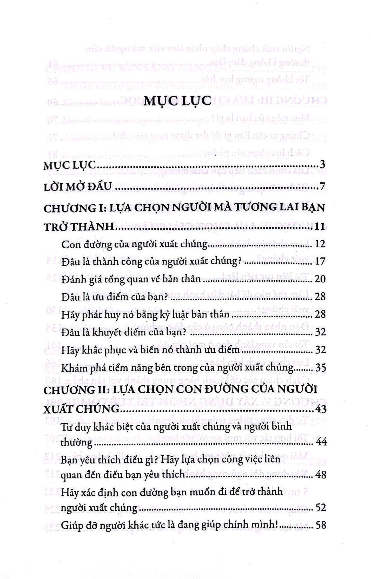 Cuốn sách gồm 8 chương với các phần hướng dẫn, chia sẻ rất đầy đủ của tác giả về hành trình trở thành người xuất chúng. Qua mỗi trang sách chúng ta sẽ rút ra được những bài học và kinh nghiệm để vượt lên mỗi ngày. Để có thể xuất chúng hơn trên hành trình của chính m.ình.