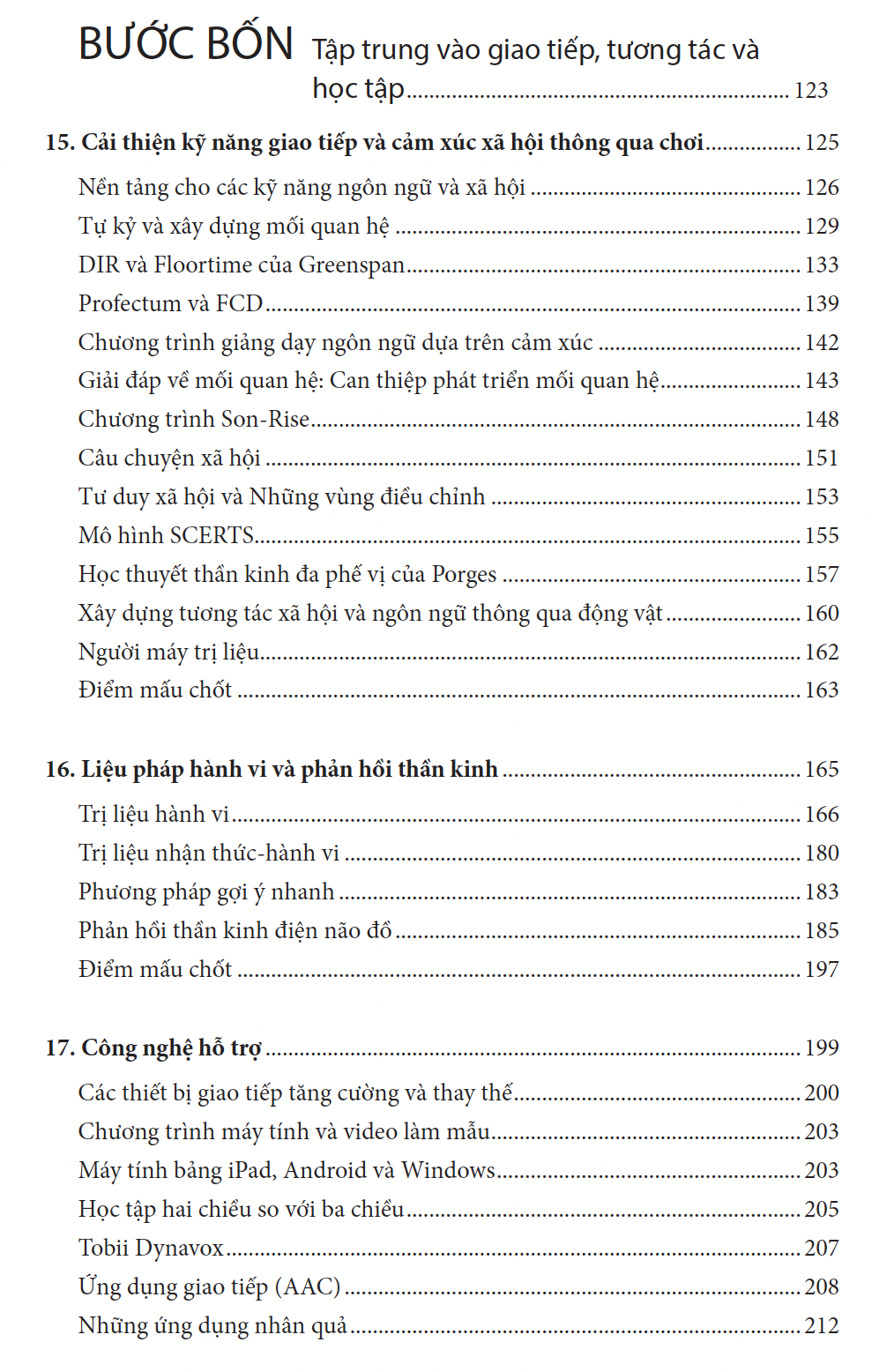 Bước 4: Giao tiếp, tương tác và học tập. Khi thể chất người tự kỷ được phục hồi, các vấn đề giác quan được giải quyết thì lúc đó, người tự kỷ mới có năng lượng dành cho giao tiếp, tương tác và học tập. Nên việc cố gắng dành nhiều thời gian để dạy trẻ giao tiếp, tương tác và học tập khi chưa thực hiện các bước 1, 2 và 3 thì chỉ làm tiêu tốn nguồn lực của các gia đình, mà không thể giải quyết vấn đề gốc rễ của tự kỷ.
