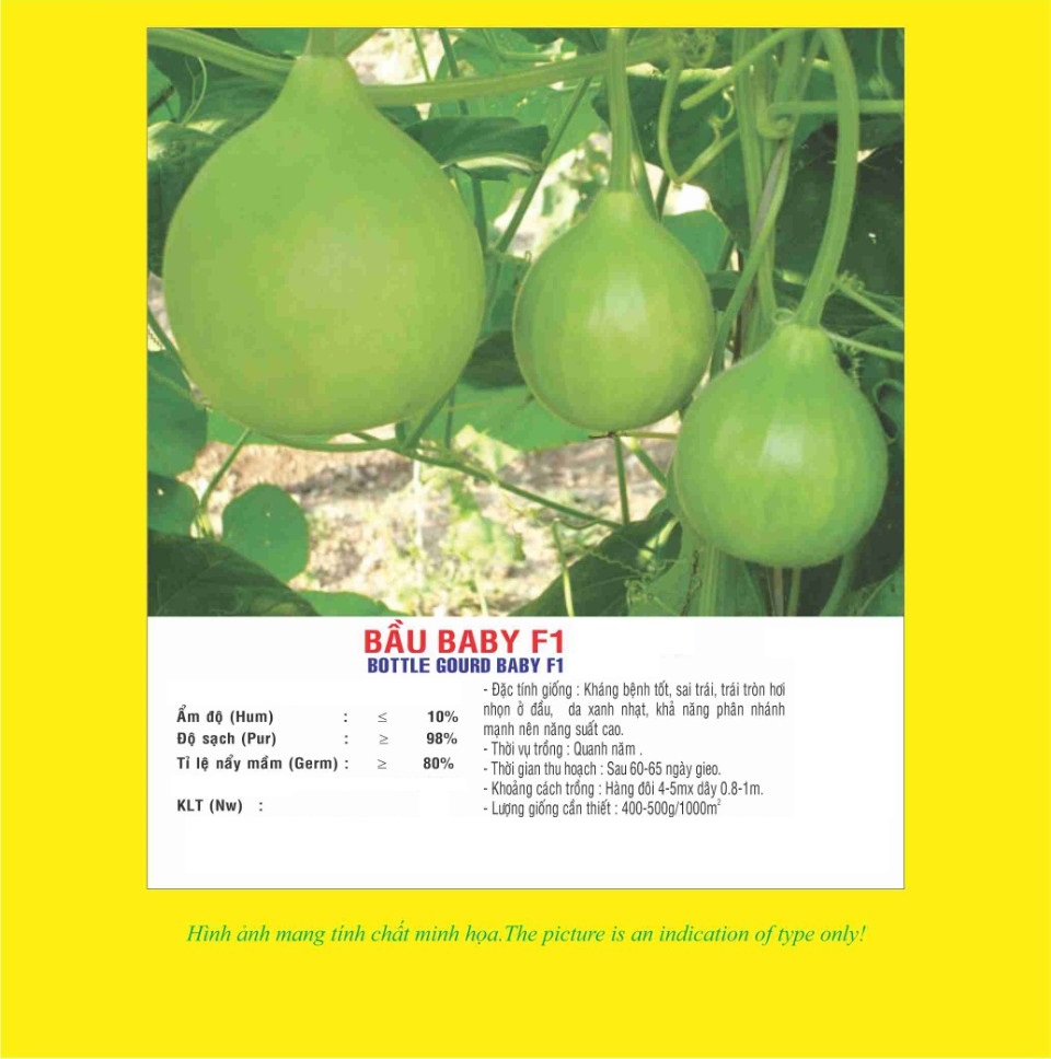 Đặc tính giống: Bầu tròn baby - Giống ngắn ngày, kháng sâu bệnh tốt, sai trái, trái trọn hơi nhọn ở đầu, da xanh nhạt, khả năng phân nhánh mạnh nên năng suất cao