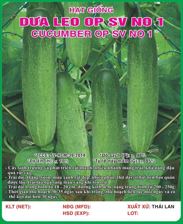 - Đặc tính giống: Dưa leo - Giống nảy mầm khỏe, kháng bệnh tốt, cây sinh trưởng và phát triển rất mạnh, nhiều nhánh mang trái và khả năng đậu trái cao. Trái dài màu xanh nhạt nhiều phấn rất đẹp, thẳng suôn, thịt dày, ít hạt bảo quản được lâu. Trái dài trung bình 18-20cm, đường kính 4cm, nặng trung bình 200-250g