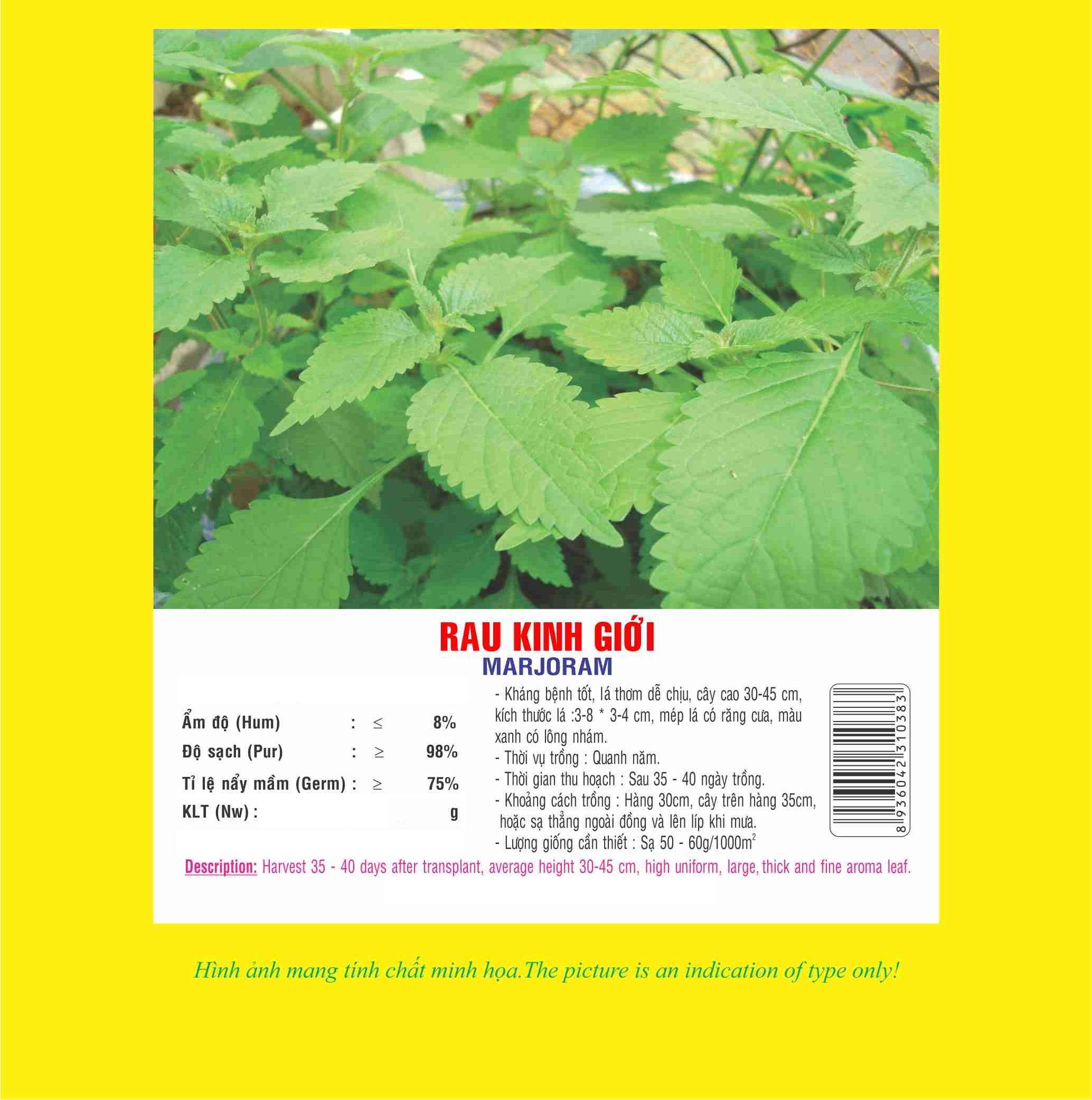 Đặc tính giống: Rau kinh giới cây thân vuông, có lông xung quanh, cay cao 30-45cm, mép lá có răng cưa và lông tơ, phiến lá dày, mắt trên và mặt dưới lá có màu xanh. Giống kháng bệnh tốt, lá lớn, thơm có mùi dễ chịu đặc trưng,
