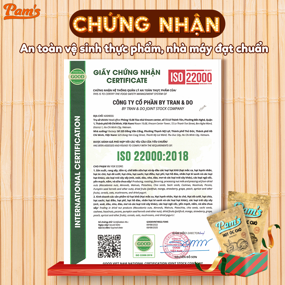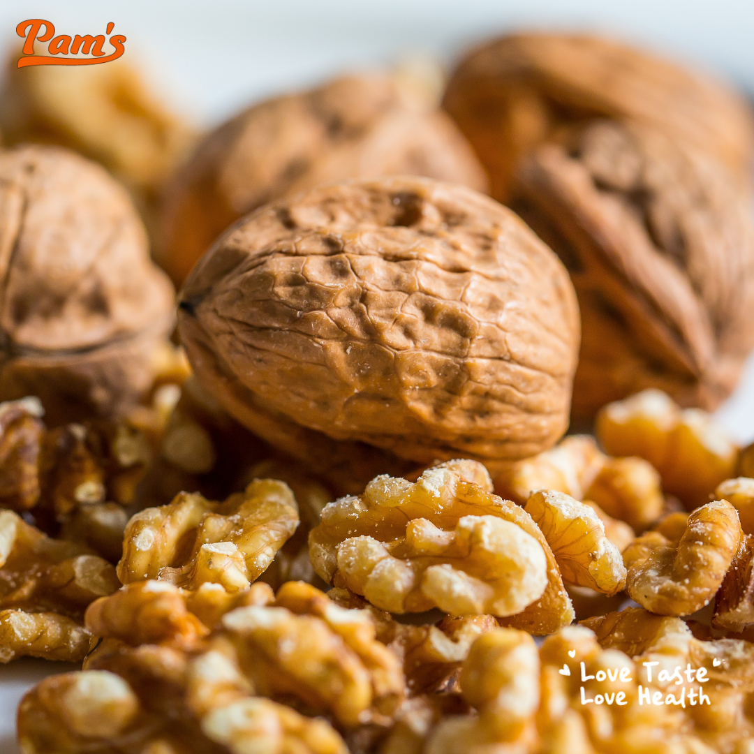 - 100g Hạt óc chó Pam's cung cấp: 710 Calo, 66g Omega3, 11g Carbs, 18g Protein, 101mg Canxi, 2.73g Sắt,