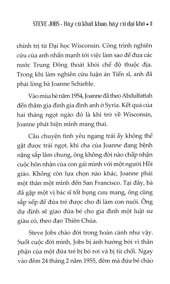 Hãy Cứ Khát Khao Hãy Cứ Dại Khờ (Sbooks) STAY HUNGRY, STAY FOOLISH - THẾ GIỚI NÀY KHÔNG VÌ BẠN LÙI BƯỚC MÀ SẼ TRỞ NÊN DỊU DÀNG VỚI BẠN HƠN, HAY CUỘC ĐỜI BẠN SẼ TRỞ NÊN TỐT ĐẸP HƠN. THẾ NÊN, HÃY CỨ KHÁT KHAO ĐI, KHÁT KHAO BẰNG TẤT CẢ NHỮNG GÌ BẠN CÓ. HÃY CỨ DẠI KHỜ ĐI, HÃY DẠI KHỜ TIN RẰNG KHÁT KHAO CỦA MÌNH NHẤT ĐỊNH SẼ TRỞ THÀNH HIỆN THỰC. Đây chắc chắn là nguồn cảm hứng tuyệt vời nhất bạn tìm thấy được từ cuộc đời của một thiên tài công nghệ Steve Jobs. Bên cạnh những nỗ lực ấn tượng liên quan đến sự ra đời của Apple, chắc chắn rất ít người biết Steve Jobs đã từng thực hiện một chiến dịch thương hiệu - một chiến dịch thể hiện rõ ràng tư duy, quan điểm, và thái độ của những người gia nhập vào ngành công nghệ. Steve Jobs từng nói: “Đó không phải vấn đề tốc độ xử lý hay bộ nhớ, nó nói về sự sáng tạo. Ở Apple chúng tôi đã quên mất mình là ai. Có một cách để nhớ bạn là ai, đó là nhớ ai là người hùng của bạn. Đây là cốt lõi của chiến dịch này”. Chiến dịch này không chỉ nhắm tới các khách hàng tiềm năng mà còn hướng tới các nhân viên của Apple. Họ đã dùng cụm từ “Tư duy khác biệt” và cũng như những người điên, “bởi chỉ những người đủ điên khùng để nghĩ họ có thể thay đổi thế giới chính là những người thay đổi thế giới”. Jobs phát biểu: Apple hướng tới những người có tư duy vượt khỏi khuôn khổ, những người muốn dùng máy tính để giúp họ thay đổi thế giới. Ngoài quảng cáo thương mại trên truyền hình, họ đã thực hiện một trong những chiến dịch quảng cáo in đáng nhớ nhất trong lịch sử. Họ cho in các tờ quảng cáo có hình các nhân vật lịch sử dễ nhận diện như Einstein, Lennon, Dylan, Picasso, Edison, Chaplin, King… với biểu tượng của Apple và dòng chữ “Tư duy khác biệt” ở góc. Điều gây tò mò ở quảng cáo này là họ in cả chân dung của những người không dễ nhận ra khiến người ta phải dừng lại và bàn tán nhau. Những người này thường có điểm chung là những người sáng tạo và chấp nhận rủi ro, không ngại thất bại và đánh cược cả sự nghiệp của mình để làm việc theo những cách khác biệt. Ý tưởng của việc quảng cáo này là động viên mọi người khẳng định chính họ như những cá thể độc lập, sáng tạo, đổi mới một cách táo bạo chỉ đơn giản bằng chiếc máy tính mà họ dùng. HÃY CỨ KHÁT KHAO, HÃY CỨ DẠI KHỜ chính là bức tranh toàn diện về cuộc đời cảm hứng của “Cha đẻ” Apple - Steve Jobs. Ở đây, bạn có thể tìm thấy những thông tin, những tuyên ngôn thuộc về Steve Jobs mà trước đây chưa ai đề cập với bạn.