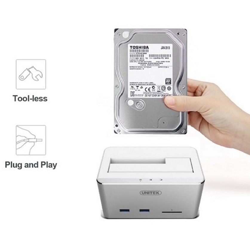 Mua tại TiktokHDD DOCKING STATION USB 3.0 -> SATA III 2.5/3.5 + 2 USB 3.0 + SD UNITEK (Y-1092) MÔ TẢ SẢN PHẨM: HÃNG :tUNITEK TRUYỀN DỮ LIỆUtUSB 3.1 GEN1 SUPERSPEED TỐC ĐỘ TRUYỀNt6Gbps HỖ TRỢ tVỚI