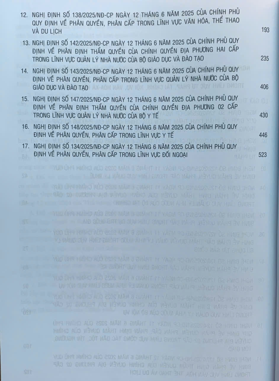Quyển 1: Hệ thống các nghị định của Chính phủ về phân quyền, phân cấp, phân định thẩm quyền giữa Chính phủ và chính quyền địa phương 2 cấp trong lĩnh vực tư pháp, tài chính, nội vụ, văn hóa – xã hội và đối ngoại (có hiệu lực thi hành từ 01/7/2025) Tác giả: Quốc Hội Nhà xuất bản: Lao Động Công ty phát hành: Dân Hiền Ngày xuất bản: 9.2025 Khổ sách: 20x28cm Số trang: 534 Giá bìa: 395.000 đ