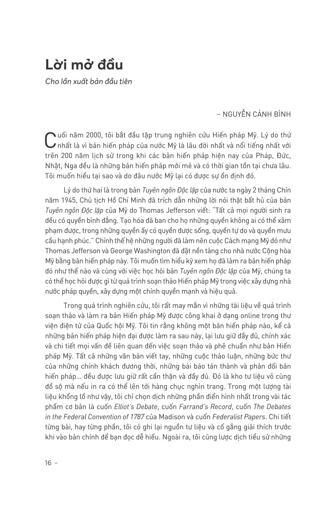 “Hiến pháp Mỹ được làm ra như thế nào?” đã cung cấp một bức tranh toàn cảnh về sự ra đời của Hiến pháp Mỹ, như một lời lý giải cho rất nhiều người có cùng mối băn khoăn. Vậy Hiến pháp Mỹ đã được làm ra như thế nào? Nó được làm ra trong những cuộc tranh luận nảy lửa tưởng như không có lối thoát và những mối bất đồng sâu sắc, bởi những bộ óc vĩ đại có một không hai trong lịch sử, và bằng một tinh thần mà người ta khó có thể tìm một tính từ nào thay thế ngoài cách gọi - “tinh thần Mỹ”. Đó là sự tôn trọng đặc biệt lẫn nhau, thừa nhận những quan điểm hoàn toàn khác biệt, chấp nhận và cùng thỏa hiệp để đi tới lợi ích chung cuối cùng