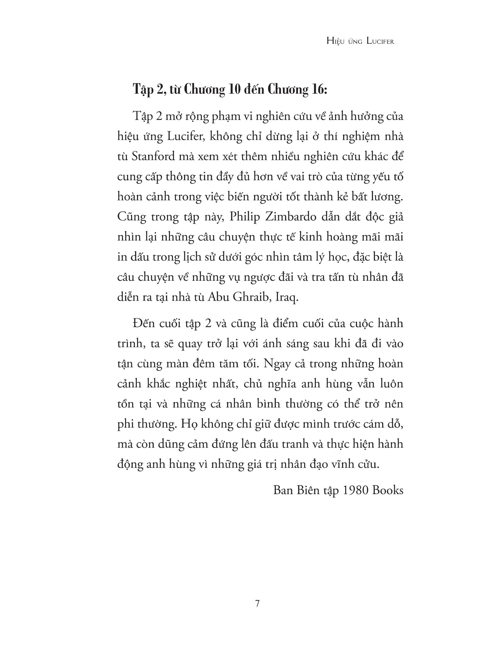 Phần tiếp theo của tập 2 viết về thí nghiệm nhà tù Stanford sẽ kể lại chi tiết tình huống nghiên cứu về sự biến đổi của các sinh viên đại học khi họ được phân công ngẫu nhiên đóng vai tù nhân hoặc cai ngục trong một nhà tù giả. Một trong những kết luận chính từ thí nghiệm nhà tù Stanford là sức mạnh của một loạt biến số hoàn cảnh, dù không biểu hiện rõ ràng nhưng lại có thể chi phối ý chí phản kháng của một cá nhân. Kết luận đó càng được khẳng định hơn trong các chương sách trình bày về hiện tượng này trong các nghiên cứu khoa học xã hội khác. Những người tham gia nghiên cứu - các sinh viên đại học và cả những công dân bình thường - đã thích ứng, tuân thủ, phục tùng và dễ dàng bị dụ dỗ thực hiện những việc mà họ không thể tưởng tượng được là mình sẽ làm khi ở ngoài hoàn cảnh đó. Chúng ta cũng sẽ vượt ra ngoài môi trường thí nghiệm để tìm hiểu về hiệu ứng Lucifer trong thực tế, đặc biệt là câu chuyện về những vụ ngược đãi và tra tấn khủng khiếp các tù nhân tại nhà ngục Abu Ghraib, Iraq. Chúng ta sẽ đào sâu vào địa điểm, con người và hoàn cảnh để đưa ra kết luận về các nguyên nhân dẫn đến những hành vi tàn bạo xuất hiện trong “bộ ảnh chiến tích” mà những người lính đã ghi lại trong quá trình hành hạ tù nhân. Hành trình khắc nghiệt đào sâu đến tận cùng bóng tối sẽ kết thúc trong chương cuối cùng. Khi đó, ta tìm hiểu một số thông tin tích cực về bản chất con người, về những gì mà mỗi cá nhân chúng ta có thể làm để đương đầu với sức mạnh của hoàn cảnh và hệ thống. Trong tất cả những nghiên cứu và các ví dụ thực tế, luôn có một số cá nhân phản kháng và không chịu khuất phục trước cám dỗ. Thứ giúp họ thoát khỏi cái ác không phải là bản tính thiện lành bẩm sinh, mà thường là do sự hiểu biết của họ (dẫu còn khá bản năng) về các chiến thuật phản kháng về mặt tinh thần và xã hội. Cuốn sách cung cấp một số chiến thuật có thể giúp mọi người chống lại những ảnh hưởng xã hội không mong muốn - những giải pháp này dựa trên sự kết hợp giữa kinh nghiệm của tác giả cùng các cộng sự trong chuyên ngành tâm lý xã hội, hay những chuyên gia về ảnh hưởng và thuyết phục. Khi hầu hết mọi người đều chịu khuất phục và chỉ một số ít dám đứng lên, những người bất tuân có thể được coi là anh hùng. Hành trình của cuốn sách này sẽ kết thúc bằng sự tích cực khi tôn vinh bản chất anh hùng tồn tại trong mỗi chúng ta. Trái ngược với “sự tầm thường của cái ác”, lý thuyết cho rằng những người bình thường đều có thể suy đồi và trở nên tàn ác, tác giả Zimbardo đặt ra thuật ngữ “sự tầm thường của chủ nghĩa anh hùng” để tôn vinh mọi người đàn ông và phụ nữ đã tuân theo lời thúc giục đấu tranh vì nhân loại khi đến thời điểm buộc phải hành động. Khi lời kêu gọi đó vang lên, họ biết rằng nó là dành cho mình. Lời thúc giục ấy kêu gọi chúng ta hãy đề cao những phần tốt đẹp nhất trong bản chất con người, vượt lên trên những áp lực mạnh mẽ của hoàn cảnh và hệ thống như một lời khẳng định rằng, phẩm giá con người đủ khả năng để chống lại cái ác. Về tác giả Philip Zimbardo được quốc tế công nhận là “gương mặt đại diện cho tâm lý học đương đại”. Nghiên cứu kinh điển của ông - thí nghiệm nhà tù Stanford - vẫn còn nguyên giá trị tham khảo sau hàng thập kỷ, không ngừng khiến công chúng ngỡ ngàng về sự biến đổi tính cách của con người dưới sự tác động của những yếu tố hoàn cảnh và hệ thống đầy uy lực. Zimbardo là giáo sư của Đại học Stanford từ năm 1968, trước đó từng giảng dạy tại các trường Yale, New York và Columbia. Ông được trao nhiều giải thưởng và danh hiệu vì những cống hiến cho ngành tâm lý học. Những đề tài nghiên cứu ông đặc biệt quan tâm là ý thức về thời gian, sự thuyết phục, sự điên rồ, sự bạo lực, tâm lý chính trị, chủ nghĩa khủng bố và chủ nghĩa anh hùng. Một số lời khen “Hiệu ứng Lucifer sẽ vĩnh viễn thay đổi cách bạn suy nghĩ về lý do khiến chúng ta hành xử theo những cách nhất định, và đặc biệt thay đổi cách bạn suy nghĩ về khả năng gây tội ác của một con người. Đây là một cuốn sách làm ta khó chịu, nhưng cực kỳ cần thiết.” - Malcolm Gladwell “Một cuốn sách quan trọ Tất cả các chính trị gia và nhà bình luận xã hộ đều nên đọc tác phẩm này.” - The Times (London). “Rất chuyên sâ Zimbardo kết hợp một nghiên cứu tâm lý xã hội dày đặc thông tin, đầy thu hút với tinh thần đạo đức chính trực, qua đó thách thức độc giả nhìn xa hơn những lời lên án hời hợt để suy ngẫm về trách nhiệm tập thể của chúng ta đối với những tệ nạn trên thế giới này.” - Publishers Weekly.