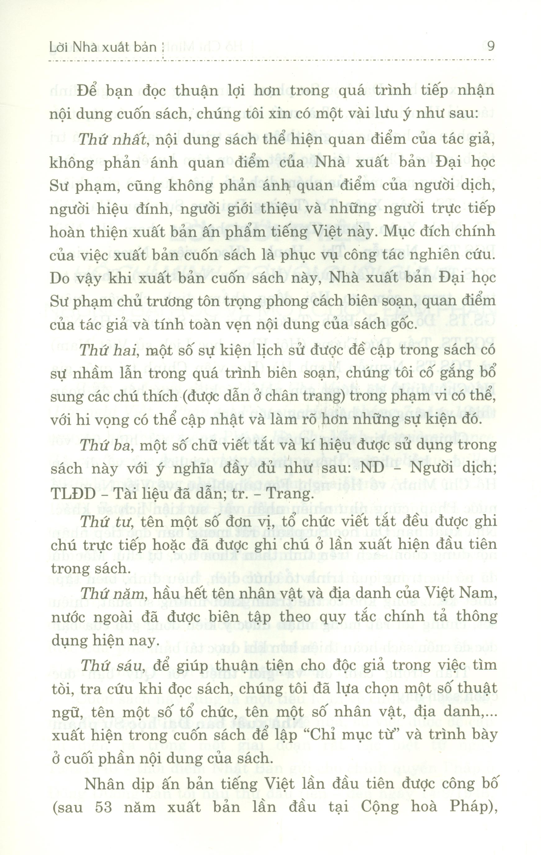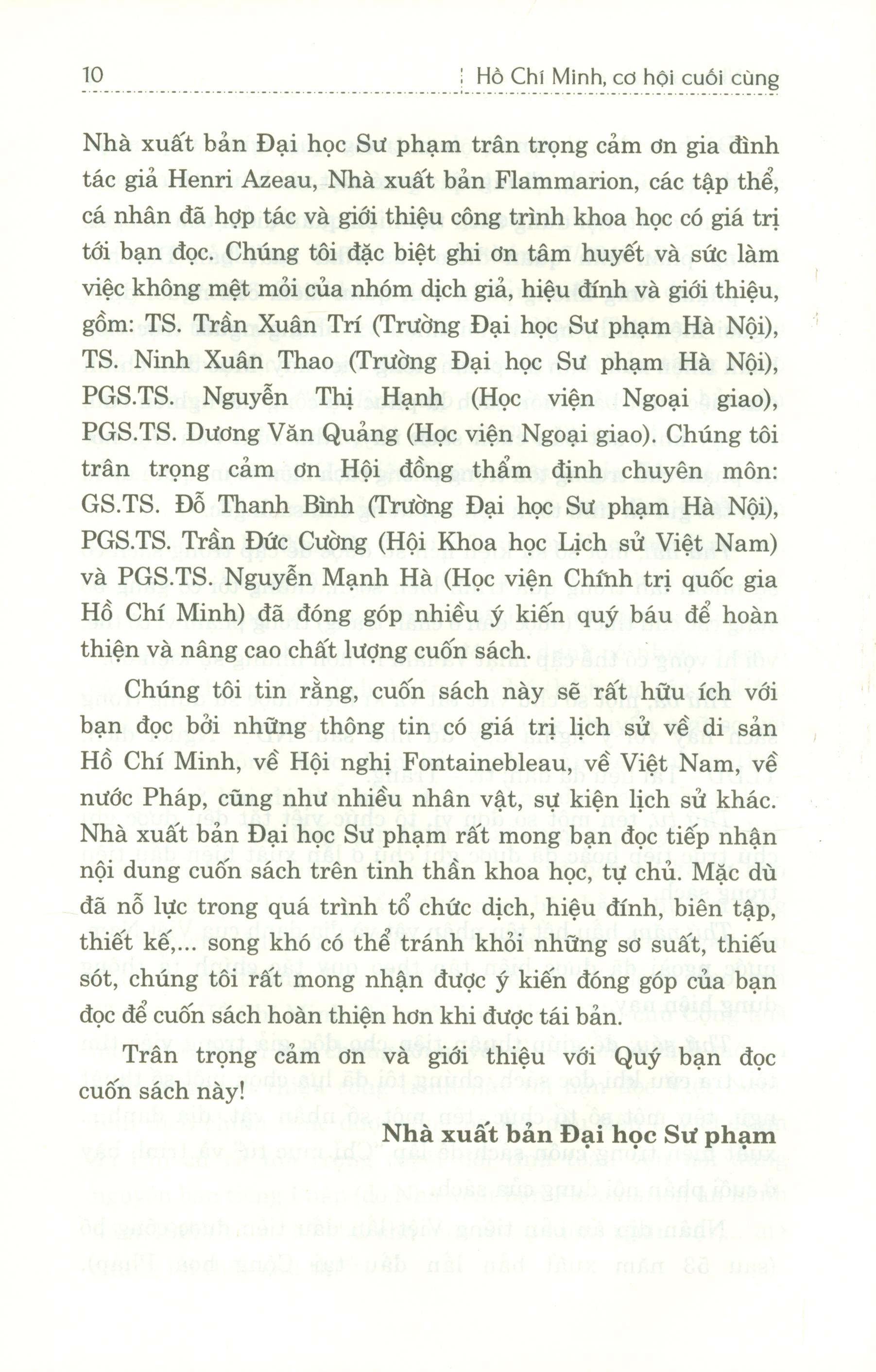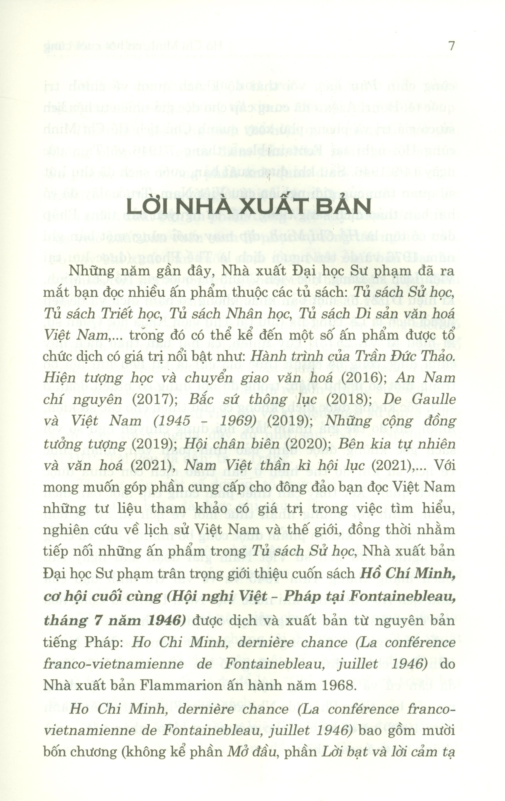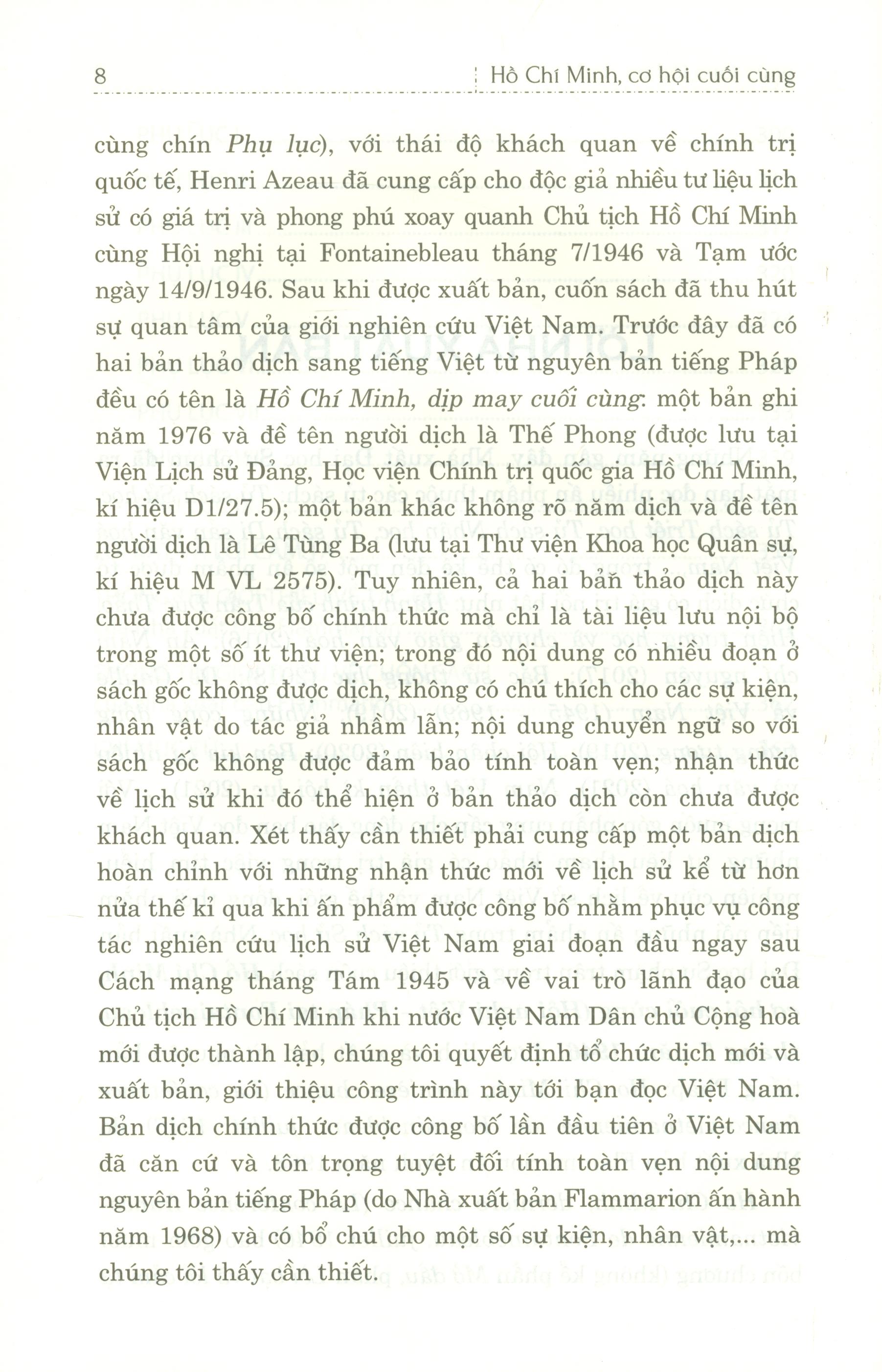 Bản dịch chính thức được công bố lần đầu tiên ở Việt Nam đã căn cứ và tôn trọng tuyệt đối tính toàn vẹn nội dung nguyên bản tiếng Pháp (do Nhà xuất bản Flammarion ấn hành năm 1968) và có bổ chú cho một số sự kiện, nhân vật,... mà chúng tôi thấy cần thiết. Chúng tôi tin rằng, cuốn sách này sẽ rất hữu ích với bạn đọc bởi những thông tin có giá trị lịch sử về di sản Hồ Chí Minh, về Hội nghị Fontainebleau, về Việt Nam, về nước Pháp, cũng như nhiều nhân vật, sự kiện lịch sử khác.