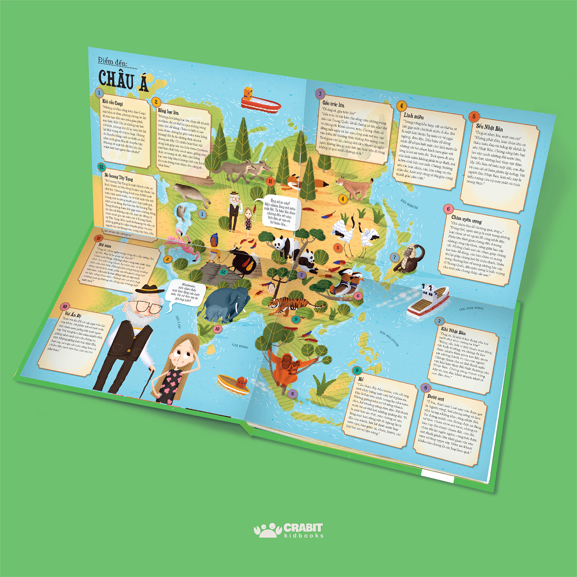 Với những cô nhóc cậu nhóc hay tò mò, muốn khám phá thế giới bao la ngoài kia thì bộ sách “Hỏa xa phiêu lưu ký” đích thực là một kho báu! Bộ sách sẽ mời trẻ bước lên chuyến tàu hỏa độc nhất vô nhị, đưa trẻ chu du vòng quanh thế giới và mỗi lần dừng chân là trẻ đang ở một lục địa mới. Tại mỗi trạm dừng, trẻ sẽ được “cấp cho” một chiếc bản đồ lật mở khổng lồ, đóng vai trò như một “hướng dẫn viên du lịch” giúp trẻ tìm tòi và khám phá những điều vô cùng hay ho ở châu lục đó. Chẳng hạn khi đặt chân đến châu Âu, trẻ sẽ biết được Phần Lan là “đất nước có nhà tắm hơi còn nhiều hơn cả ô tô”, biết được cây cầu dài nhất thế giới nối liền hai quốc gia là Đan Mạch và Thủy Điển, biết được thiên nga trắng là một trong những loài chim nặng nhất thế giới (có em nặng đến 12 kg lận đó). Các thông tin về địa lý, văn hóa, món ăn truyền thống, động vật đặc hữ ở từng châu lục được chọn để giới thiệu với trẻ đều là những thông tin mới mẻ, thú vị, đảm bảo đưa trẻ đi từ bất ngờ này đến bất ngờ khác và không thể dừng chuyến hành trình tàu hỏa đặc biệt này được một khi đã bước chân lên tàu!
