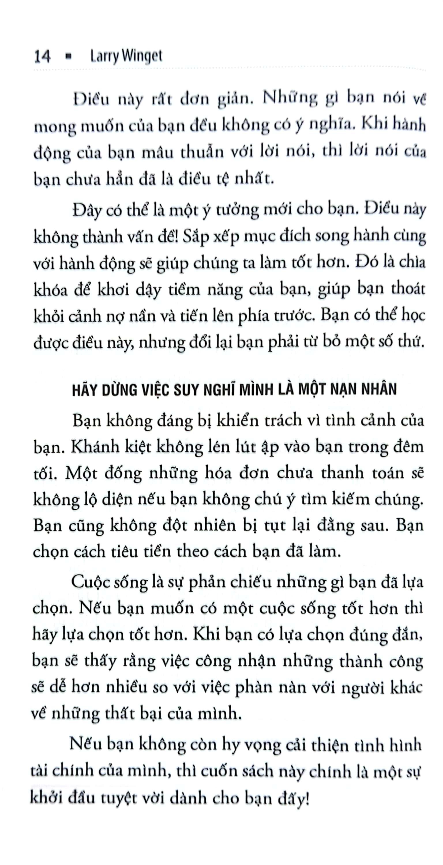 Trong cuốn sách này, Larry Winget đưa ra những phương pháp rõ ràng, cụ thể và dễ áp dụng để kiểm soát chi tiêu. Đó là những việc làm hết sức đơn giản nhưng mang lại hiệu quả bất ngờ, như bỏ truyền hình cáp, hạn chế đi ăn nhà hàng, dọn dẹp nhà cửa,… hay những việc làm mang tính dài hạn như lên kế hoạch chi tiêu hàng tháng, chuyển sang một căn hộ mới, dạy dỗ con cái về tài chính… Xen kẽ là những bài tập thực hành nho nhỏ, những câu chuyện, ví dụ đơn giản và gần gũi, giúp người đọc hiểu rõ hơn về thực trạng tài chính của bản thân và có thêm động lực để thoát khỏi tình trạng khó khăn.
