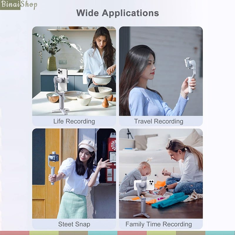 Gậy chống rung Wiwu 3-Axis Stabilized Gimbal S5B Thương hiệu: Wiwu Áp dụng cho điện thoại thông minh dưới 6 inch. Gopro 3/4/5/6 tương thích với Android và iOS, bộ chuyển đổi camera hành động có kích thước tương tự Thời gian sạc: 5 giờ Thời gian làm việc: 10-12 giờ Màu sắc: đen Chất liệu: ABS Gimba ổn định 3 trục ổn định hơn không rung lắc Đáp ứng các góc chụp rộng, chụp ngang & dọc Pin tốt thời gian sử dụng lên tới 12h Nhận dạng và theo dõi khuôn mặt/ đối tượng thông minh Hỗ trợ chụp toàn cảnh 180 độ/ 330 độ