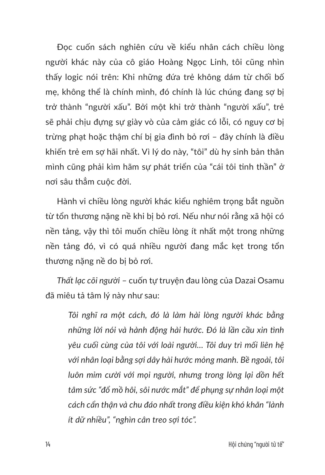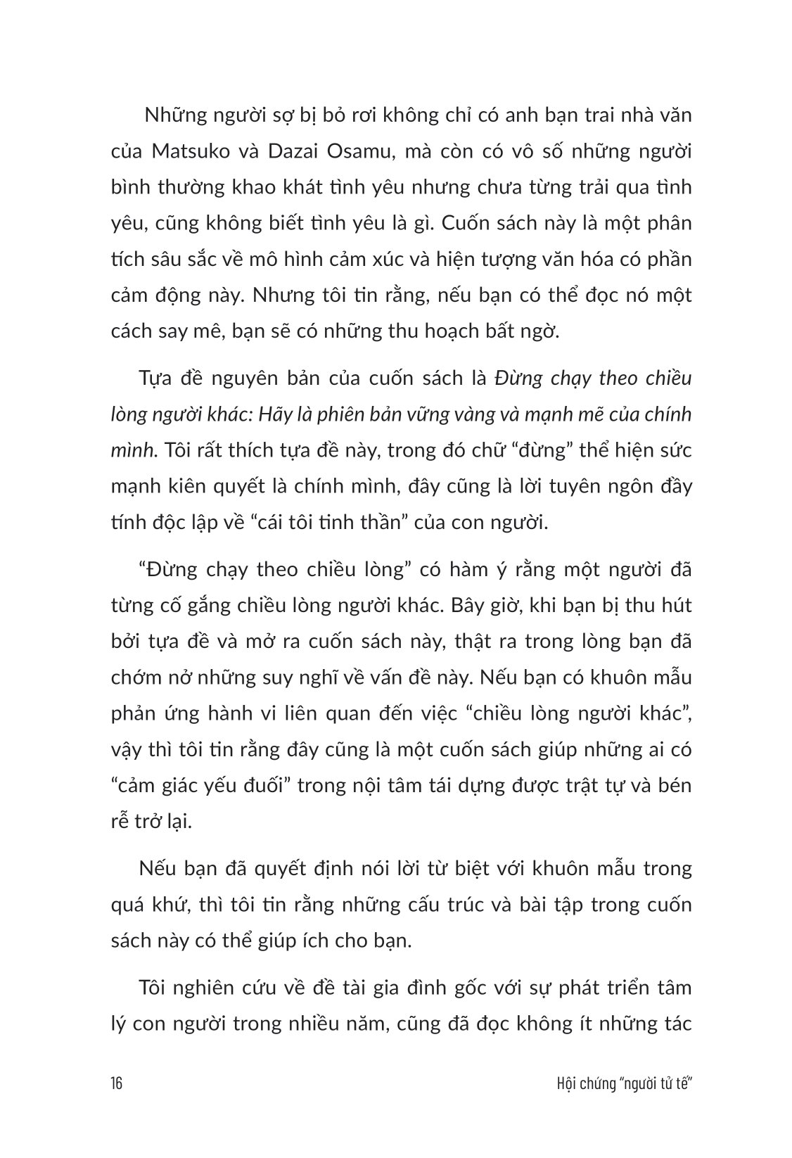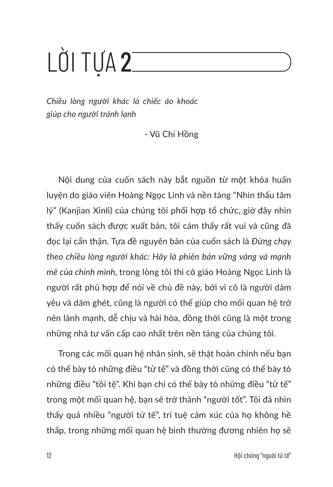 Mua tại TiktokMã hàng 8935325019715 Tên Nhà Cung Cấp AZ Việt Nam Tác giả Hoàng Ngọc Linh Người Dịch Minh Ngọc NXB Thế Giới Năm XB 2024 Ngôn Ngữ Tiếng Việt Trọng lượng (gr) 320 Kích Thước Bao Bì 20.5 x 14 x 1.5 cm Số trang 304 Hình thức Bìa Mềm Hội Chứng “Người Tử Tế” - Vì Sao Bạn Luôn Muốn Chiều Lòng Người Khác THỨC TỈNH! BẠN CÀNG CHIỀU LÒNG NGƯỜI KHÁC, MỐI QUAN HỆ CÀNG TỆ! Trên thực tế, những người có cá tính, không thỏa hiệp thường nhận được sự tôn trọng của mọi người; những người dám bày tỏ mong muốn, thậm chí là thể hiện ra ngoài sự yếu đuối, lại càng dễ nhận được sự ủng hộ và giúp đỡ từ người khác. Cuốn sách này sẽ giúp bạn ngừng chiều lòng thiên hạ và sống tự tin với bốn giai đoạn: