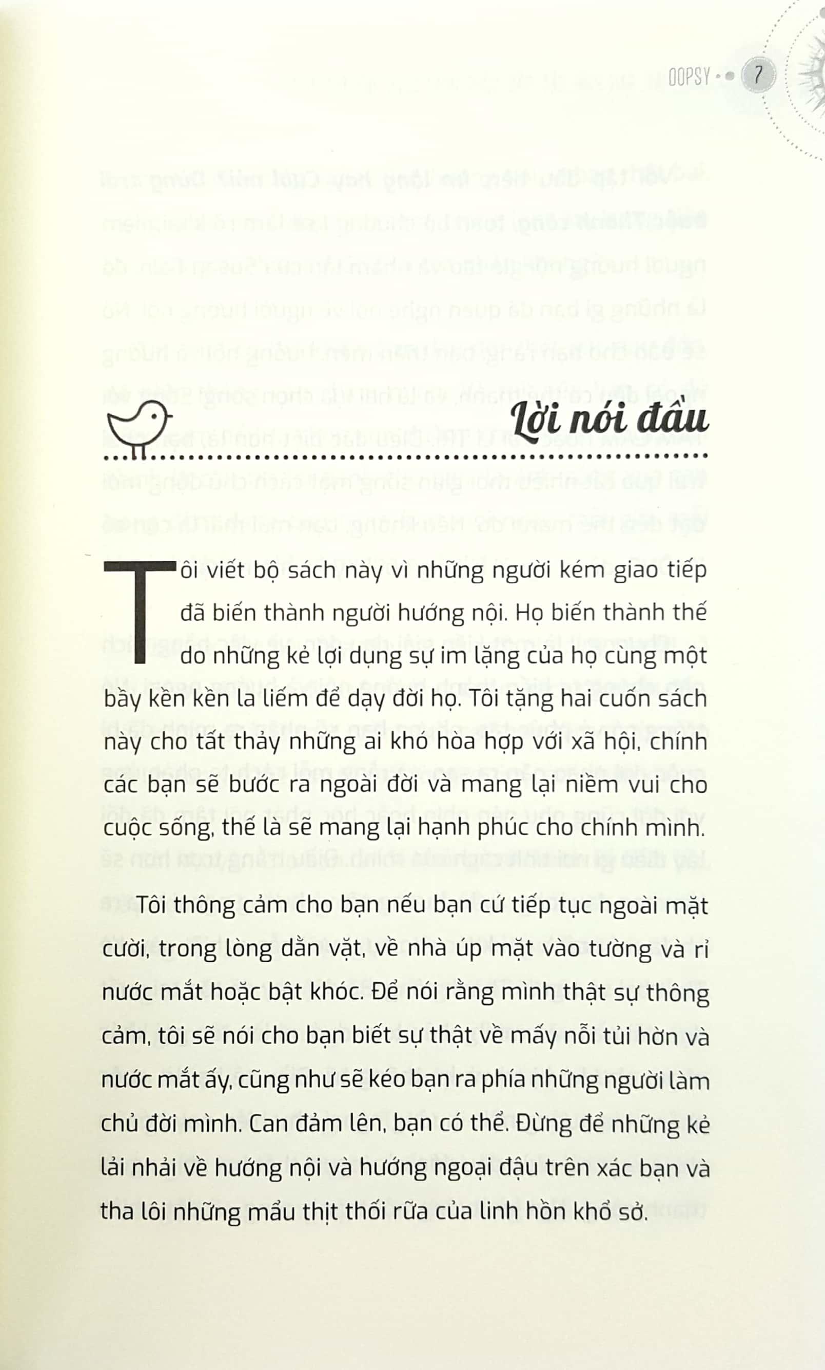 Tôi thông cảm cho bạn nếu bạn cứ tiếp tục ngoài mặt cười, trong lòng dằn vặt, về nhà úp mặt vào tường và rỉ nước mắt hoặc bật khóc. Để nói rằng mình thật sự thông cảm, tôi sẽ nói cho bạn biết sự thật về mấy nỗi tủi hờn và nước mắt ấy, cũng như sẽ kéo bạn ra phía những người làm chủ đời mình. Can đảm lên, bạn có thể. Đừng để những kẻ lải nhải về hướng nội và hướng ngoại đậu trên xác bạn và tha lôi những mẩu thịt thối rữa của linh hồn khổ sở” - tác giả Oopsy chia sẻ.