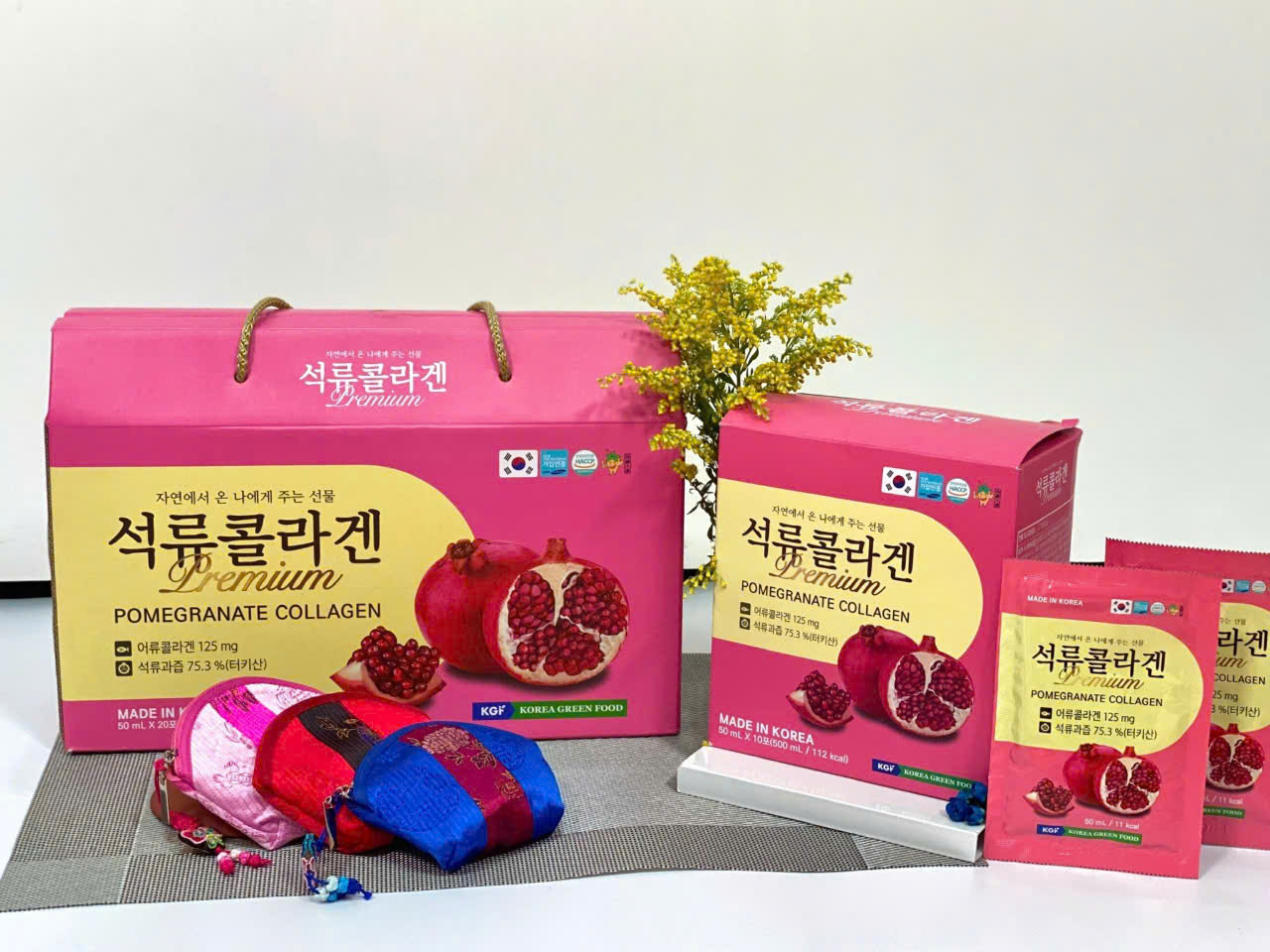 TINH CHẤT LỰU COLLAGEN - Pomegranate Collagen Premium 50 ml x 60 gói Thành phần: Nước ép lựu 75.3% (Thổ Nhĩ Kỳ, hàm lượng chất rắn 12%), collagen 125 mg, chiết xuất hỗn hợp thảo