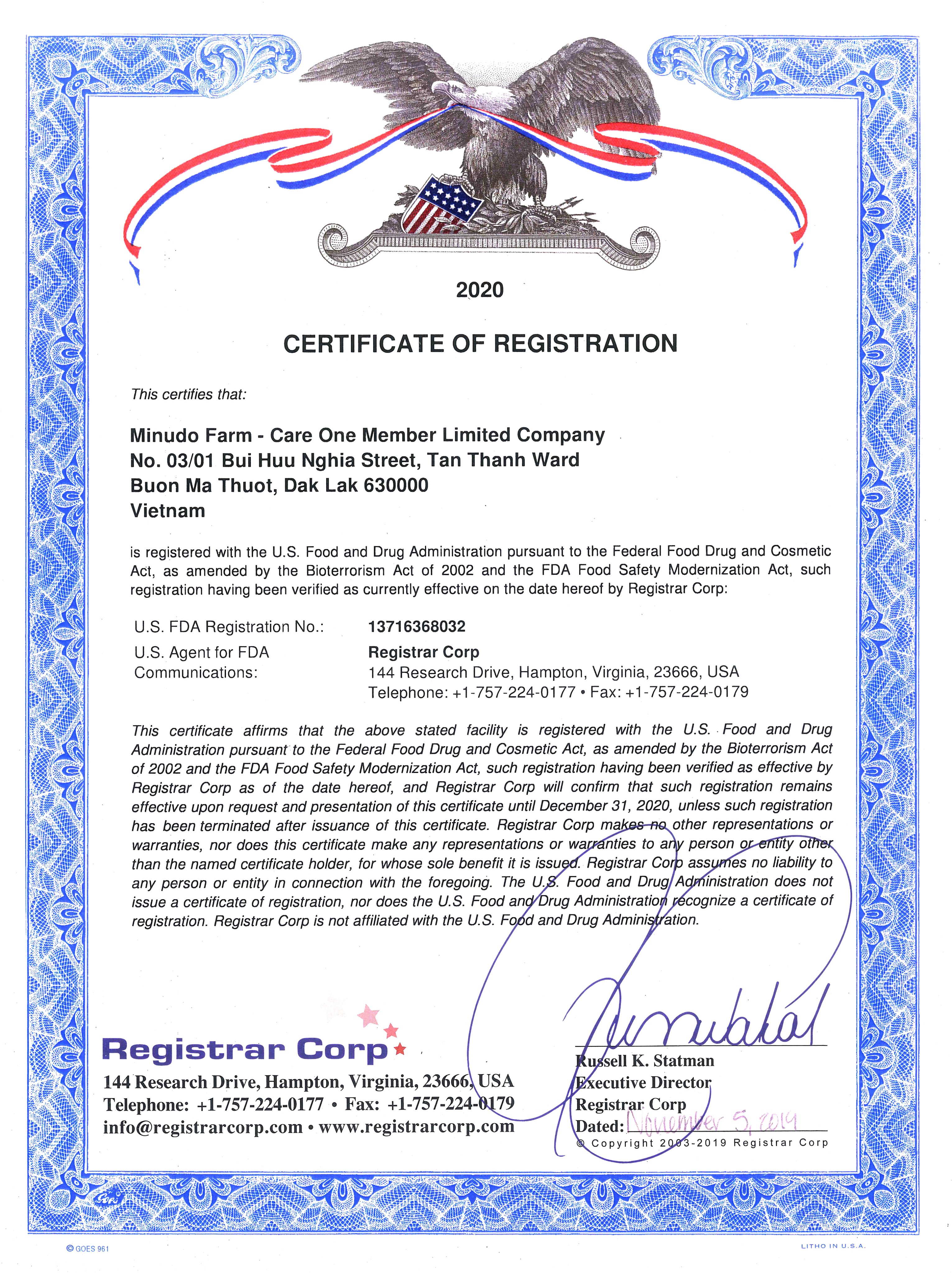 100% Quả chín mới được thu hoạch để đảm bảo hương vị ngon nhất. ️Quy trình sản xuất đạt tiêu chuẩn Châu Âu: HACCP Codex Alimentarius: Chứng nhận vệ sinh an toàn thực phẩm, được Quốc tế công nhận. ISO 22000-2018: Chứng nhận quản lý chất lượng về quy trình sản xuất. FDA (Mỹ): Chứng nhận vệ sinh an toàn thực phẩm của Mỹ. Chứng nhận cà phê đặc sản: Chứng nhận cà phê đạt chuẩn đặc sản trong 3 năm liên tiếp. HACCP: Chứng nhận vệ sinh an toàn thực phẩm Việt Nam.