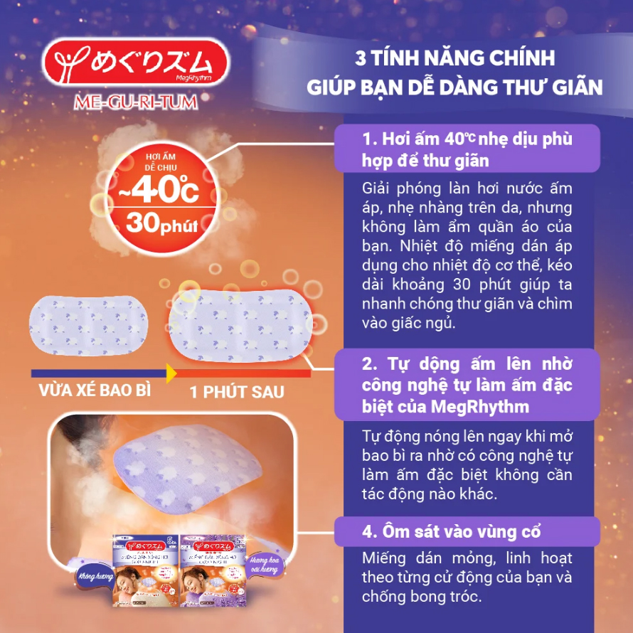Thương hiệu: MegRhythm (Nhật Bản) Nhà sản xuất: Kao corporation Nơi sản xuất: Nhật Bản Cách đóng gói: Hộp 12 miếng - Miếng dán massage nhiệt Good night Kao là biện pháp giảm thiểu