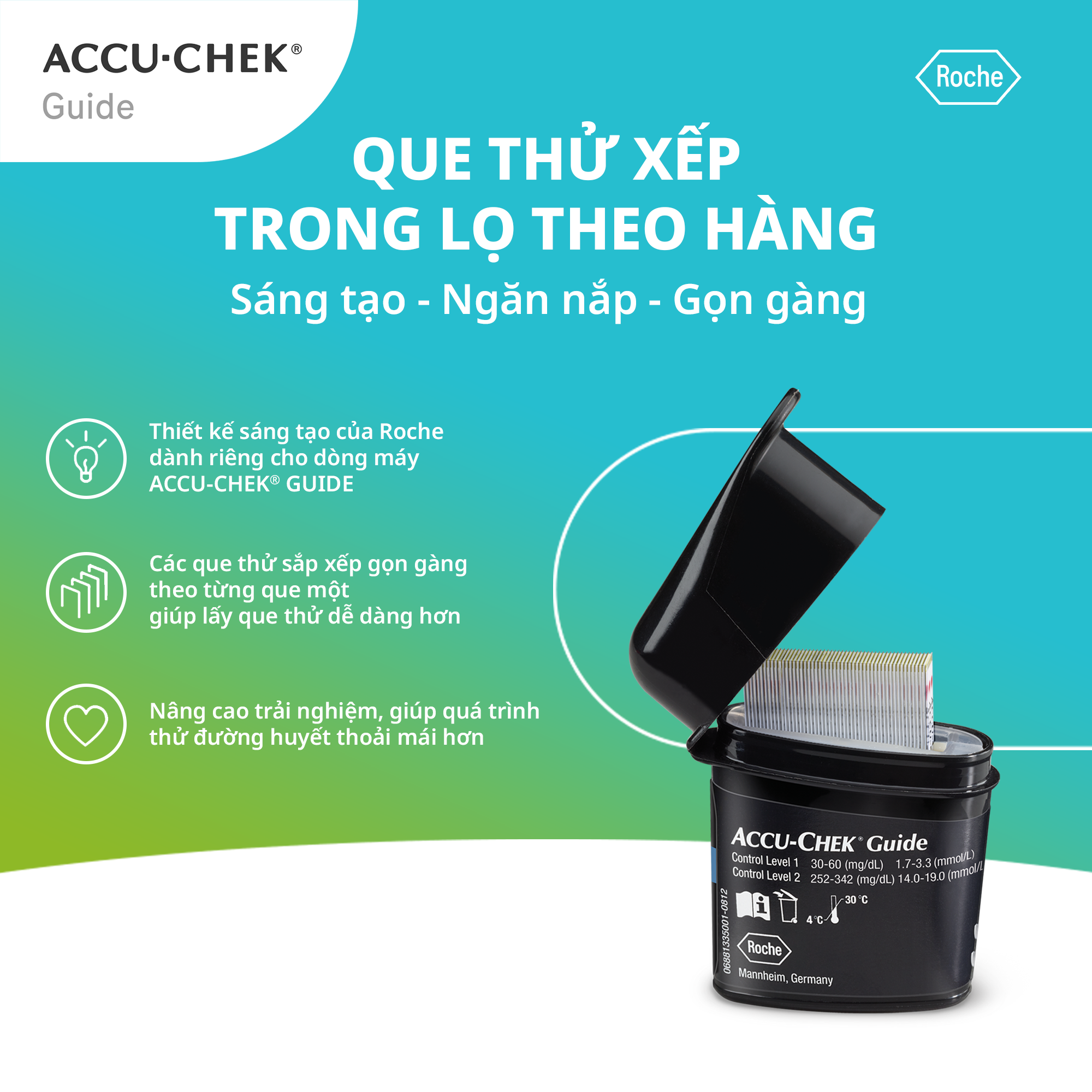 - 25 que thử đường huyết dùng cho máy đo đường huyết ACCU-CHEK Guide. TÍNH NĂNG VÀ TIỆN ÍCH