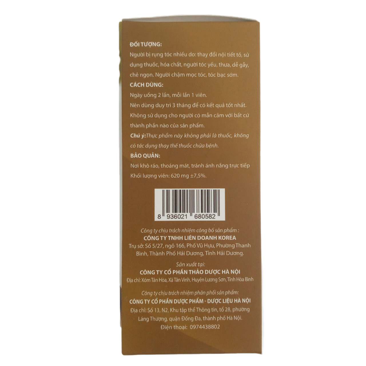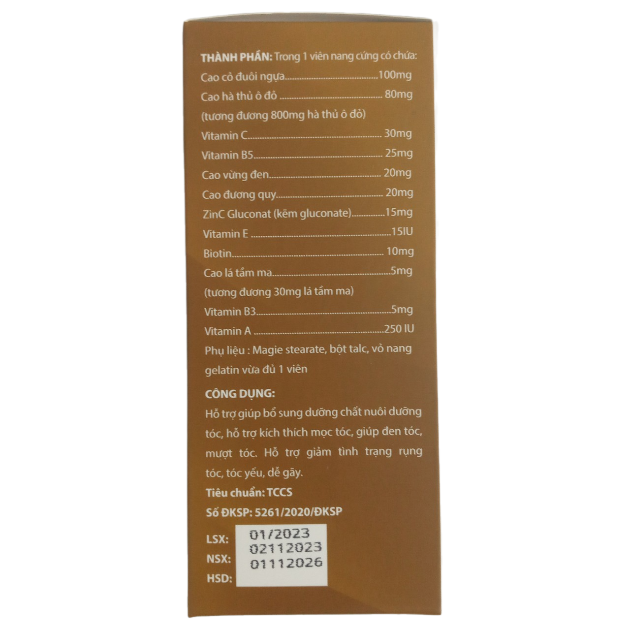 Thành phần Hà thủ ô: 120 mg Đương quy: 35 mg Thục địa: 75 mg Ngấy hương: 50 mg Trắc bá diệp: 50 mg Vừng đen: 10 mg Cỏ nhọ nồi: 37.5 mg Nghệ: 1