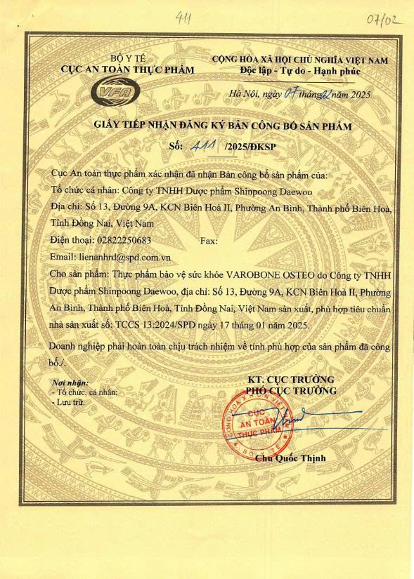 Đặt cam kết: “Vì sức khỏe mọi người” vào từng sản phẩm, Shinpoong Pharma không ngừng nỗ lực tạo nên những giải pháp toàn diện về sức khỏe dựa trên gần 63 năm nghiên cứu khoa học, thành tựu về công nghệ và nguyên liệu chất lượng nhập khẩu, tuyển chọn từ các chuyên gia hàng đầu tại Hàn Quốc và Việt Nam.   THỰC PHẨM BẢO VỆ SỨC KHỎE | VAROBONE OSTEO - Viên uống bổ sung CALCI, Vitamin D3 Hỗ trợ cải thiện tình trạng loãng xương ở người lớn; cải thiện xương và răng chắc khỏe    THÀNH PHẦN - Calci carbonat (tương đương 400 mg Calci) . 1000 mg - Magnesi oxyd (tương đương 120 mg Magnesi) ... 199 mg - Kẽm gluconat (tương đương 10 mg Kẽm)  ...  70 mg - Vitamin B6 (dưới dạng Pyridoxin hydroclorid)  ....  2 mg - Vitamin D3 (dưới dạng Cholecalciferol)  .  400 IU    CÔNG DỤNG: Hỗ trợ cải thiện răng và xương chắc khỏe. Hỗ trợ cải thiện tình trạng loãng xương ở người lớn. Bổ sung Calci, vitamin D3 cho cơ thể.    CÁCH DÙNG Người lớn và trẻ em trên 14 tuổi: 1 viên/lần x 1 – 2 lần/ngày, uống sau khi ăn sáng và ăn trưa.    ĐỐI TƯỢNG SỬ DỤNG Người lớn và trẻ em trên 14 tuổi, phụ nữ có thai và cho con bú có nhu cầu bổ sung Calci, vitamin D3 cho cơ thể. Người lớn bị loãng xương    BẢO QUẢN Trong bao bì kín, ở nơi khô, tránh ánh sáng, nhiệt độ dưới 30ºC.    HSD: 36 tháng kể từ ngày sản xuất.   QUY CÁCH
