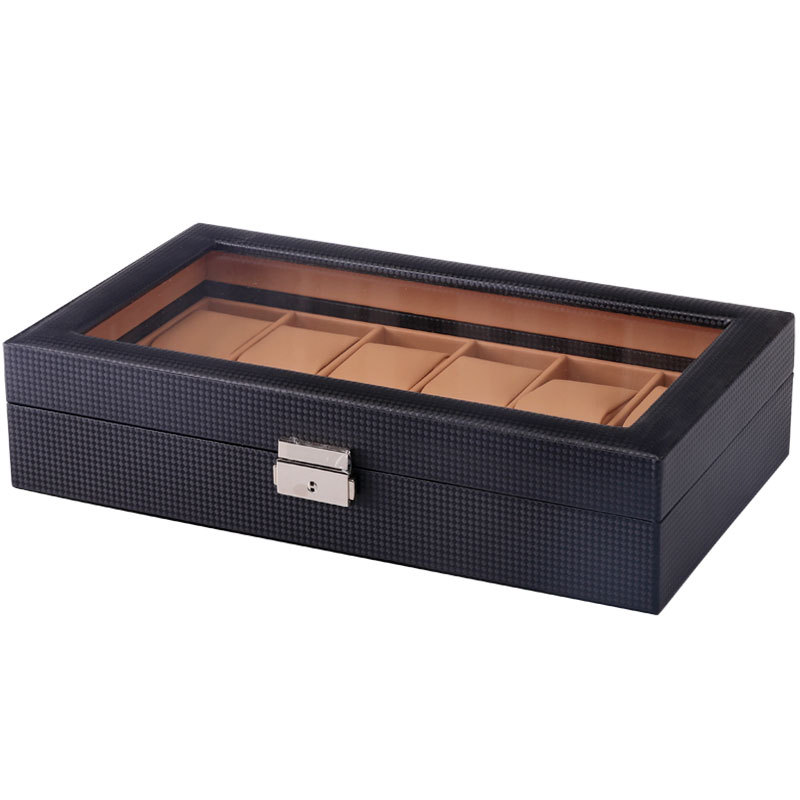 Hộp Đựng 6 Đồng Hồ & Trang Sức 2 Tầng Da Vân Carbon Nắp Kính Khóa Kim Loại - D6TC
