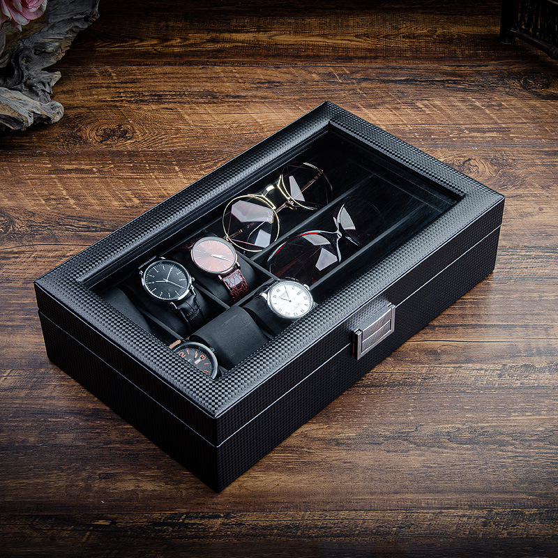 Hộp Đựng 6 Đồng Hồ & Trang Sức 2 Tầng Da Vân Carbon Nắp Kính Khóa Kim Loại - D6TC