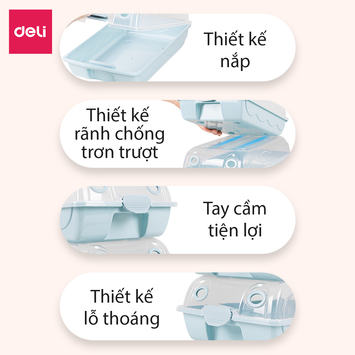 - Thiết kế phù hợp để đựng nhiều loại giày khác nhau. Deli Home Living sẽ mang cho bạn một trong những trải nghiệm về tiện ích đời sống hàng ngày. Với phương châm sản xuất những sản phẩm chất lượng tốt và luôn đặt khách hàng làm trọng tâm, sứ mệnh của Deli là làm hài hòng người tiêu dùng toàn cầu với những sản phẩm chất lượng cao, độ tin cậy tuyệt đối và thân thiện với người dùng. Khách hàng lựa chọn các sản phẩm của Deli_homeliving sẽ được cam kết: - Sản phẩm chính hãng từ nhà máy Deli, nguồn gốc rõ ràng và chất lượng đạt tiêu chuẩn. - Bảo hành theo quy định của nhà sản xuất. - Giá cả hợp lý, cạnh tranh, rẻ nhất thị trường. - Hỗ trợ đổi trả hàng cho những sản phẩm bị thiếu.