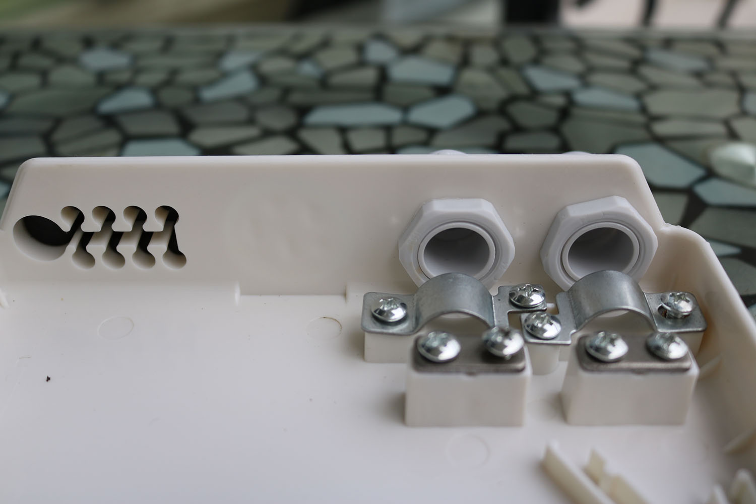 Lối cáp vào được sắp xếp thông minh, thuận tiện cho hướng cáp vào ra thuận lợi. Cáp vào được chia làm hai cổng riêng biệt bằng ốc siết cáp PG16 sử dụng được nhiều loại với đường kính từ 9mm trở xuống.
