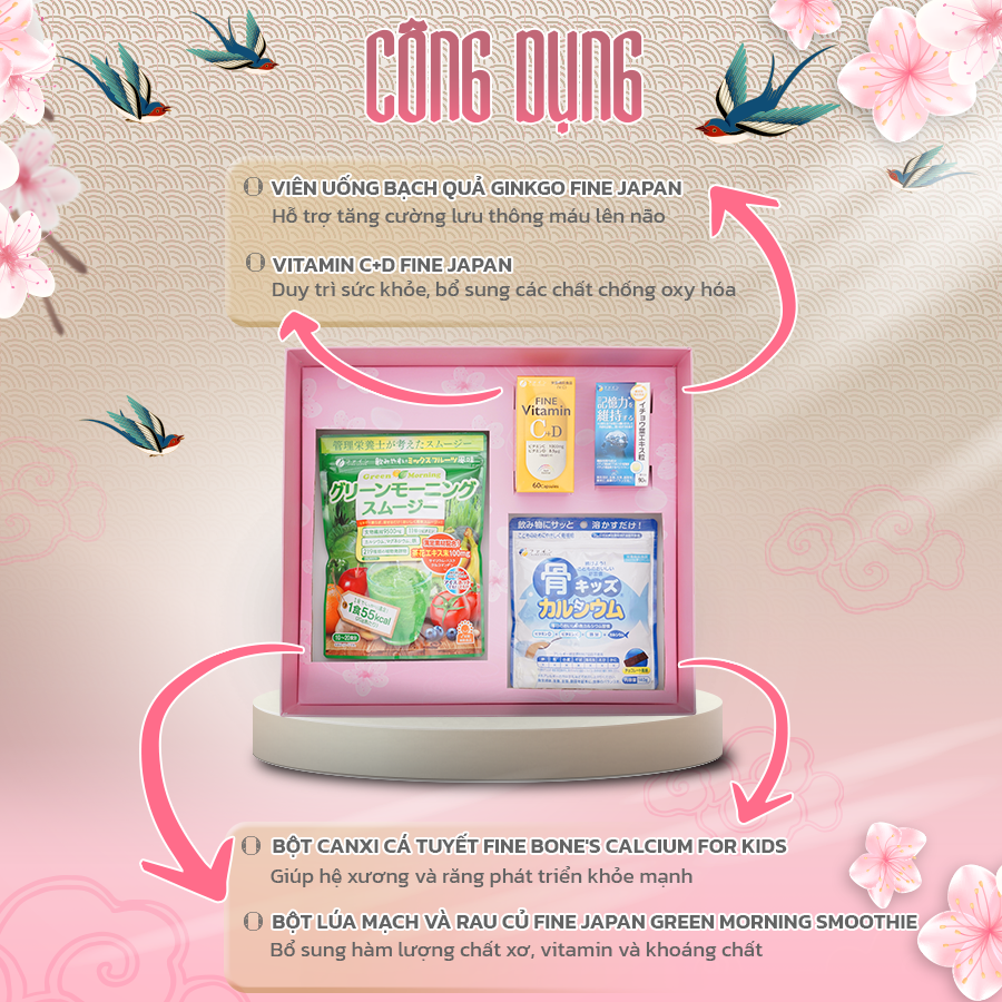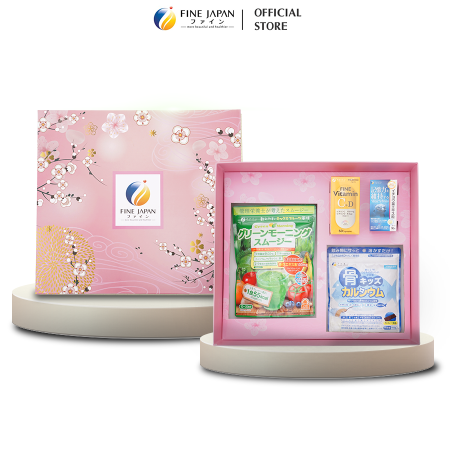 Combo SAKURA TẾT VIÊN MÃN - Bột Lúa Mạch Và Rau Củ Fine Japan Green Morning Smoothie Gói 200g - Vitamin C+D Fine Japan Ngăn Ngừa Suy Nhược Cơ Thể Hộp 60 Viên - Viên Uống Bạch Quả Ginkgo Fine Japan Hỗ Trợ Chức Năng Não Hộp 18g (90 viên) - Bột Canxi Cá Tuyết Fine Bone's Calcium For Kids Gói 140G Bổ Sung Canxi Phát Triển Chi COMBO SAKURA TẾT VIÊN MÃN là quà tết được săn đón hàng đầu tết 2023, combo bổ sung chất dinh dưỡng được người Nhật Bản tin dùng để duy trì sức khỏe cho mọi lứa tuổi (người già, người đi làm, em bé,), đảm bảo đầy đủ dưỡng chất và xây dựng hệ thống miễn dịch vững chắc cho cơ thể.