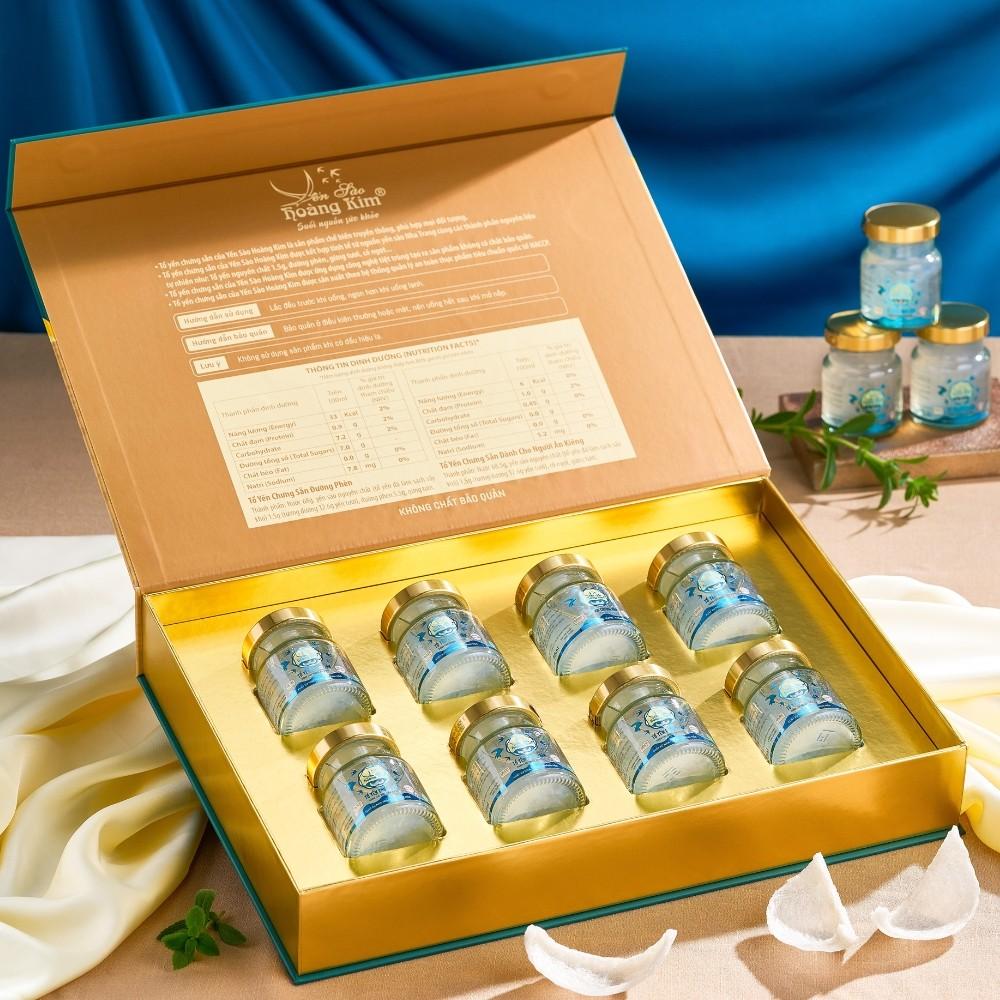 Hộp Quà 8 Hũ Yến Chưng Sẵn Hoàng Kim (Hàm Lượng Yến Thật 1.5g/Hũ) - Giải Pháp Dinh Dưỡng Ưu Việt Hộp Quà Tặng Yến Sào Chưng Sẵn Hoàng Kim là giải pháp dinh dưỡng cao cấp dành cho những ai tìm kiếm giá trị thật và hiệu quả bồi bổ rõ rệt từ yến sào. Với hàm lượng yến thật 1.5g vượt trội, sản phẩm mang đến sự khác biệt rõ rệt so với các loại nước yến thông thường trên thị trường. ƯU ĐIỂM VƯỢT TRỘI CỦA SẢN PHẨM: Hàm Lượng Yến Thật 1.5g/Hũ: Mỗi hũ chứa 1.5g yến sào nguyên chất (tương đương 12.6g yến tươi), cung cấp nguồn dinh dưỡng dồi dào giúp phục hồi thể lực, giảm mệt mỏi, cải thiện giấc ngủ và làm đẹp da. Sợi Yến Thật Nguyên Bản: Sản phẩm giữ trọn vẹn kết cấu sợi yến thật dai ngon, mang lại trải nghiệm thưởng thức chân thật và bổ dưỡng. Hương Vị Tự Nhiên, Truyền Thống: Được chưng cất theo công thức gia truyền với đường phèn ngọt thanh, gừng tươi và lá dứa, không sử dụng hương liệu. Tiện Lợi & Sang Trọng: Hộp quà 8 hũ thiết kế tinh tế, là món quà sức khỏe đẳng cấp và vô cùng tiện lợi, có thể sử dụng ngay mà không cần chế biến. CAM KẾT TỪ THƯƠNG HIỆU YẾN SÀO HOÀNG KIM (OCOP 4 SAO KHÁNH HÒA): Chất lượng được khẳng định: Sản phẩm đạt chứng nhận OCOP 4 Sao và quy trình sản xuất chuẩn quốc tế HACCP. Nguồn gốc minh bạch: Cam kết yến sào nguyên chất 100% từ Nha Trang - Khánh Hòa. An toàn cho sức khỏe: Không sử dụng chất bảo quản, không hương liệu, không chất tẩy rửa. Truy xuất nguồn gốc: Sản phẩm có tem chống giả của Bộ Công An và mã QR để kiểm tra thông tin.