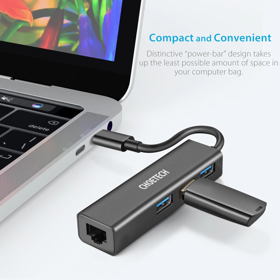 Hub Adapter chuyển đổi 4 in 1 Type-C ra 3 cổng USB 3.0 & cổng LAN RJ45 hiệu CHOETECH U02BK dùng cho Macbook / Laptop (tốc độ cao, kết nối nhiều thiết bị, kết nối internet có dây)       HỖ TRỢ MỞ RỘNG KẾT NỐI Với 1 chiếc Hub này, nó sẽ mở ra cho bạn 3 cổng kết nối USB 3.0 giúp bạn dễ dàng kết nối với các thiết bị ngoại vi như chuột, bàn phím, USB cho Macbook / laptop / PC một cách dễ dàng. Ngoài ra chiếc Hub này còn hỗ trợ một cổng LAN RJ45 giúp bạn kết nối internet có dây khi không có wifi.           THIẾT KẾ NHỎ GỌN Với thiết kế nhỏ gọn chỉ như 1 chiếc USB, nó dễ dàng cho bạn mang theo đến bất kỳ đâu bạn muốn.           TỐC ĐỘ TUYỀN TẢI DỮ LIỆU CAO Với chuẩn USB 3.0 cho cả 3 cổng, giúp tốc độ dữ liệu truyền tãi lên đến 5GB/s, giúp bạn có thể sao chép 1 lượng dữ liệu lớn trong thời gian ngắn. Nhanh gấp 10 lần chuẩn 2.0 cũ.               KHÔNG HỀ KÉN THIẾT BỊ Hỗ trợ sử dụng được hầu hết các thiết bị ngoại vi sử dụng cổng USB như quạt mini, phím, chuột, máy in, USB, cáp mạng một cách sễ dàng.         VẬT LIỆU CAO CẤP Với thành phần từ hợp kim cao cấp và được gia công làm bóng một cách tỉ mỉ, sản phẩm cho cái nhìn thanh lịch và sang trọng từ bên ngoài, chắc chắn và chất lượng từ bên trong.               PHÙ HỢP VỚI NHIỀU HOẠT ĐỘNG HẰNG NGÀY Bạn dễ dàng mang chúng đến văn phòng để sử dụng, dùng để kết nối với phím chuột chơi game, hay dùng kết nối thiết bị âm thanh để nghe nhạc, tất cả đều được.