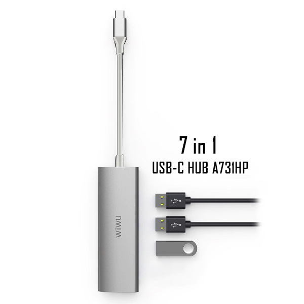 Hub sạc nhanh đa năng 7 in 1 chia cổng Type-C hiệu WIWU ALPHA A731HP thành cổng Type-C PD 3.0, 3 cổng USB 3.0, SD & Micro SD, cổng HDMI chuẩn 4k cho Macbook Pro / Smartphone đạt chứng nhận MFI.